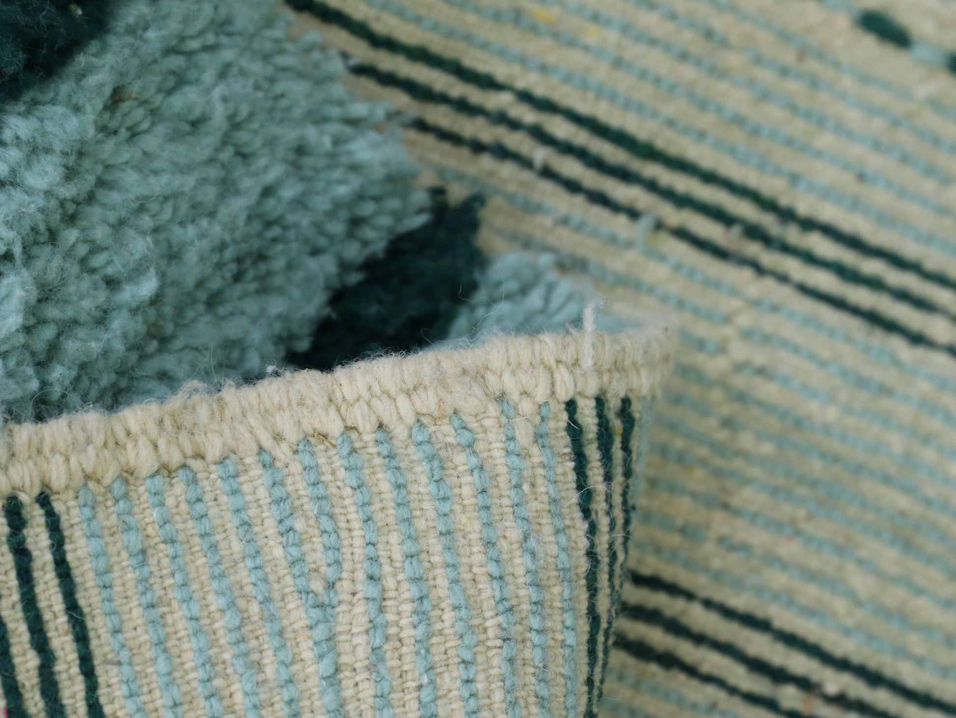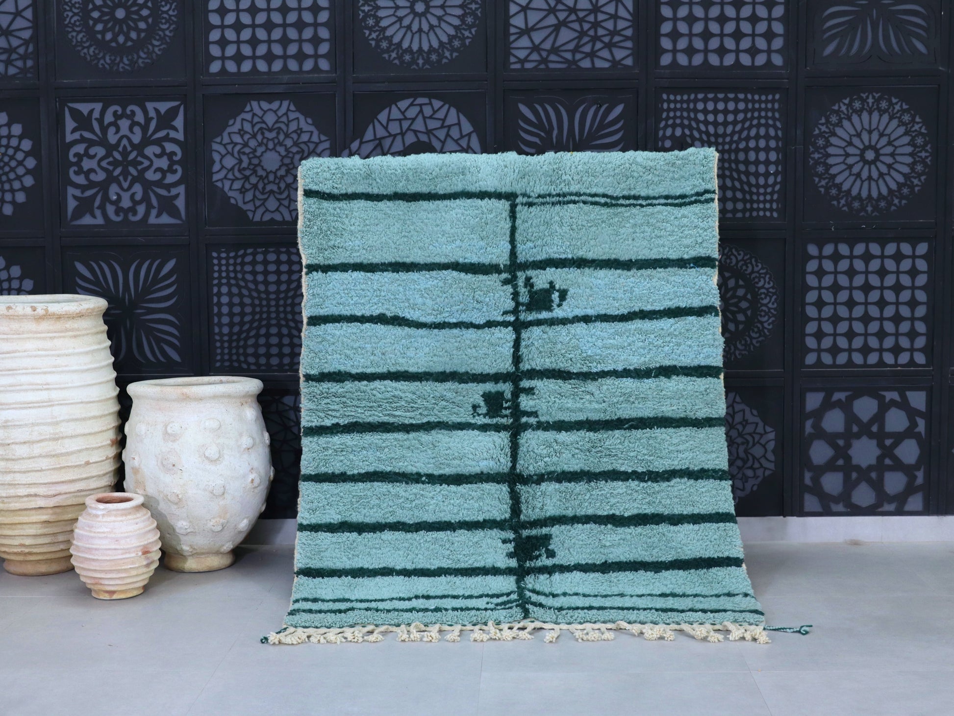 This handmade Beni Ourain rug features a refreshing mint green base with deep green tribal-style stripes, crafted from 100% natural wool by skilled Moroccan artisans. Known for their softness and timeless design, Beni Ourain rugs like this one bring calm, cozy energy to minimalist, boho, or modern interiors. A rare color variation on a traditional Berber classic.