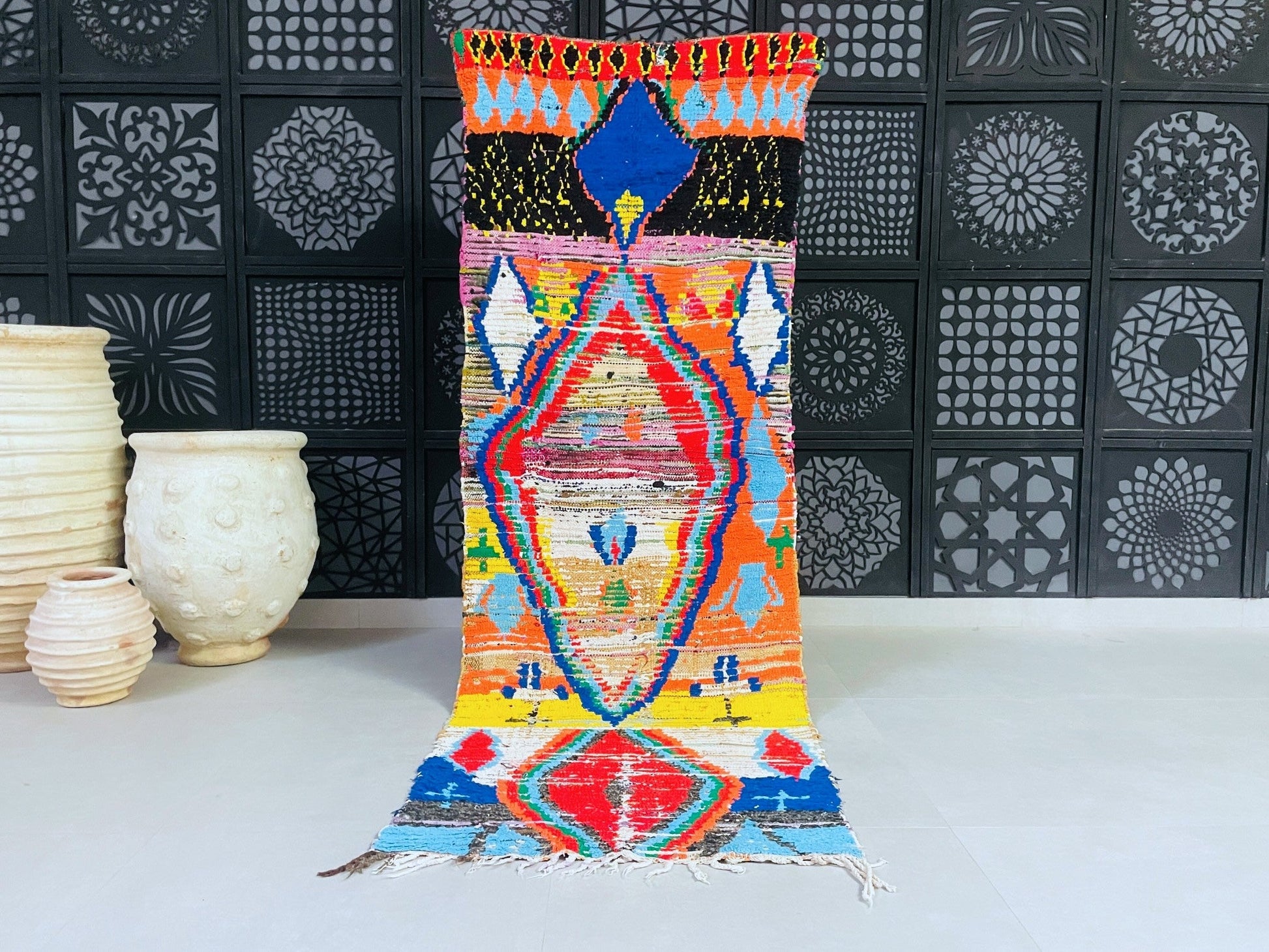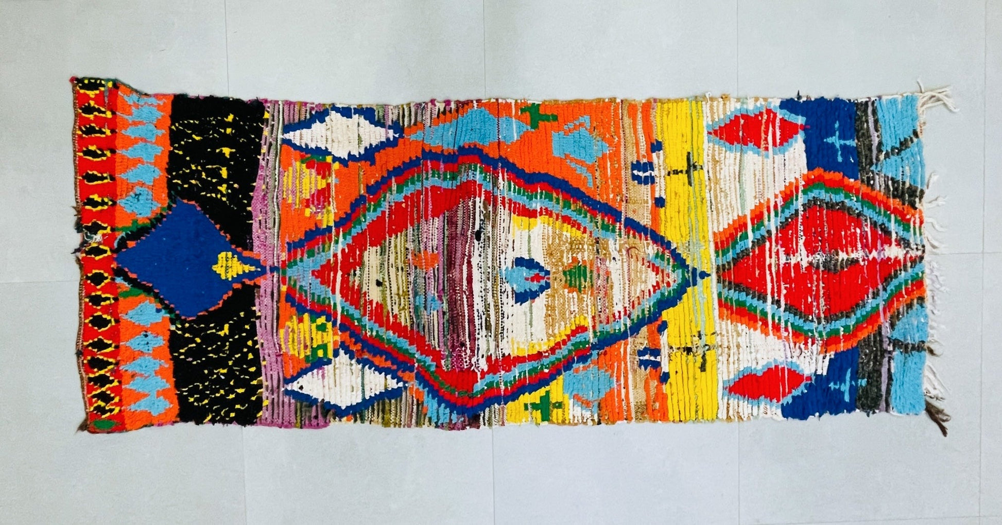 This vibrant Moroccan Boucherouite rug is a true artistic statement, featuring a kaleidoscope of colors in a mesmerizing diamond pattern. Handwoven by Berber artisans using recycled wool and textiles, this rug brings an eclectic bohemian charm to any space. Perfect for living rooms, creative studios, or cozy corners, its plush texture and playful design make it a one-of-a-kind piece.