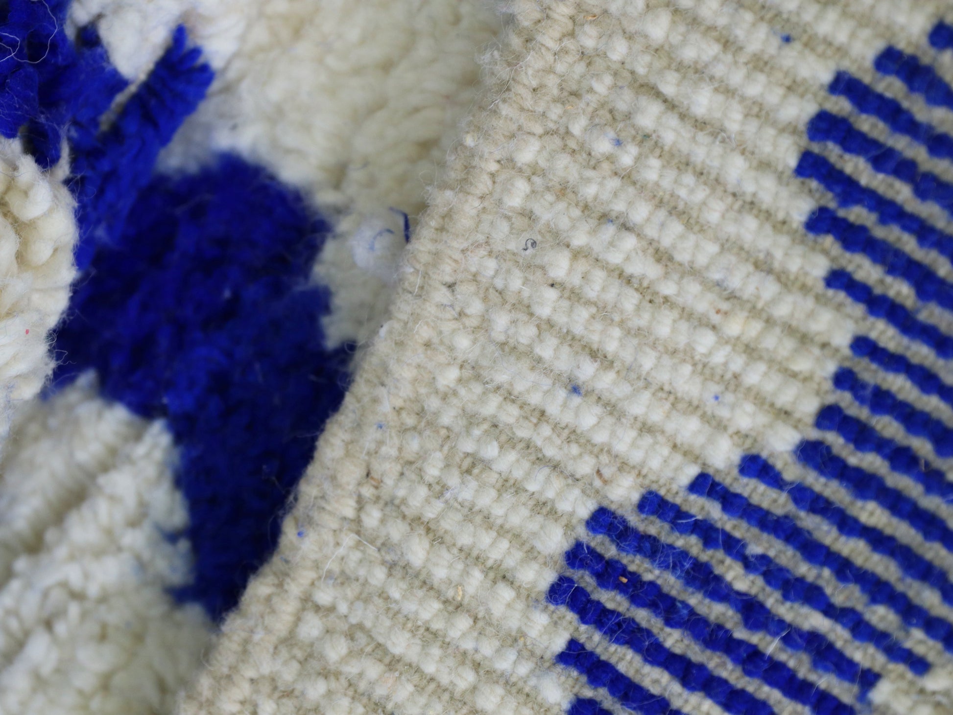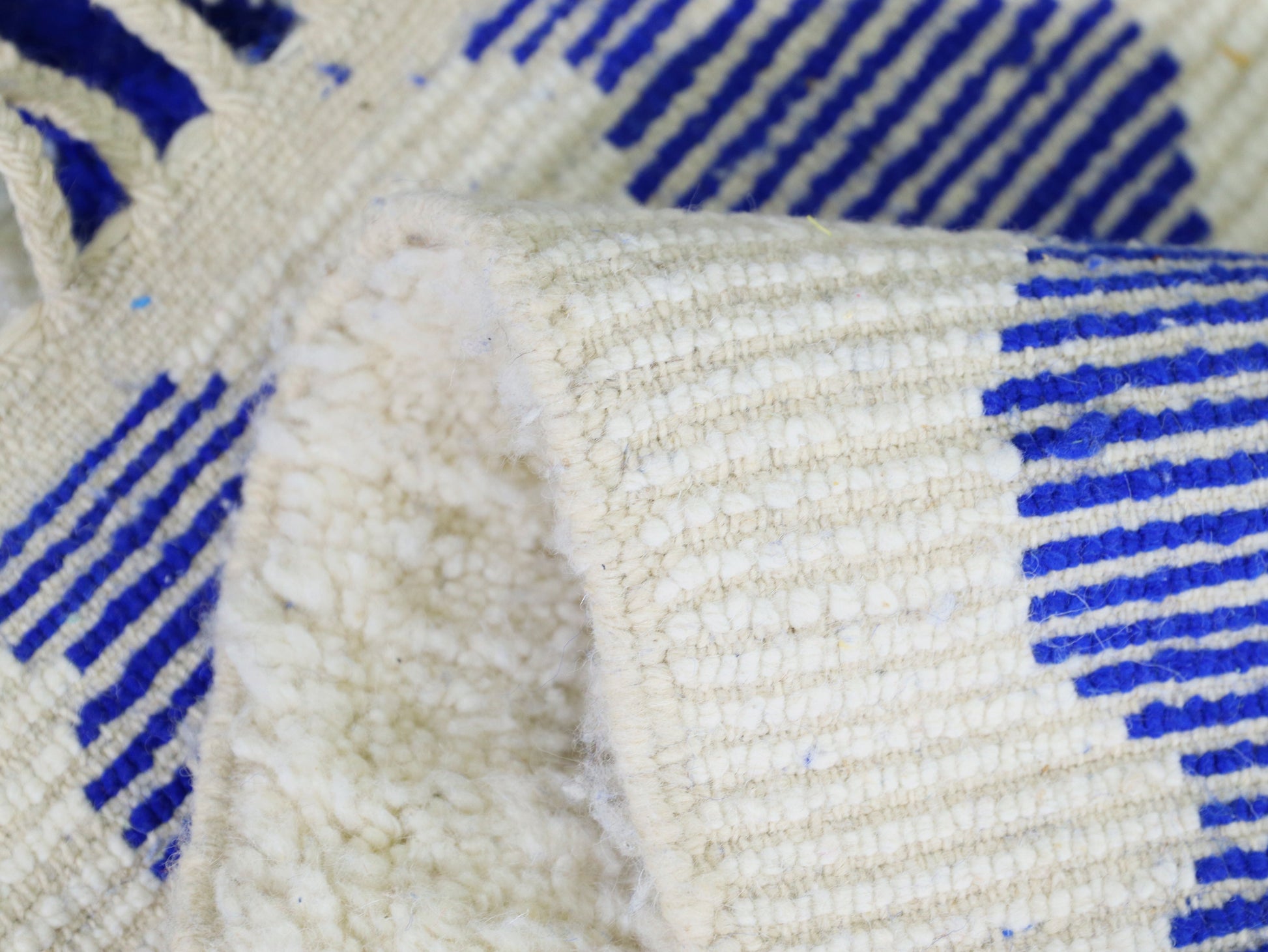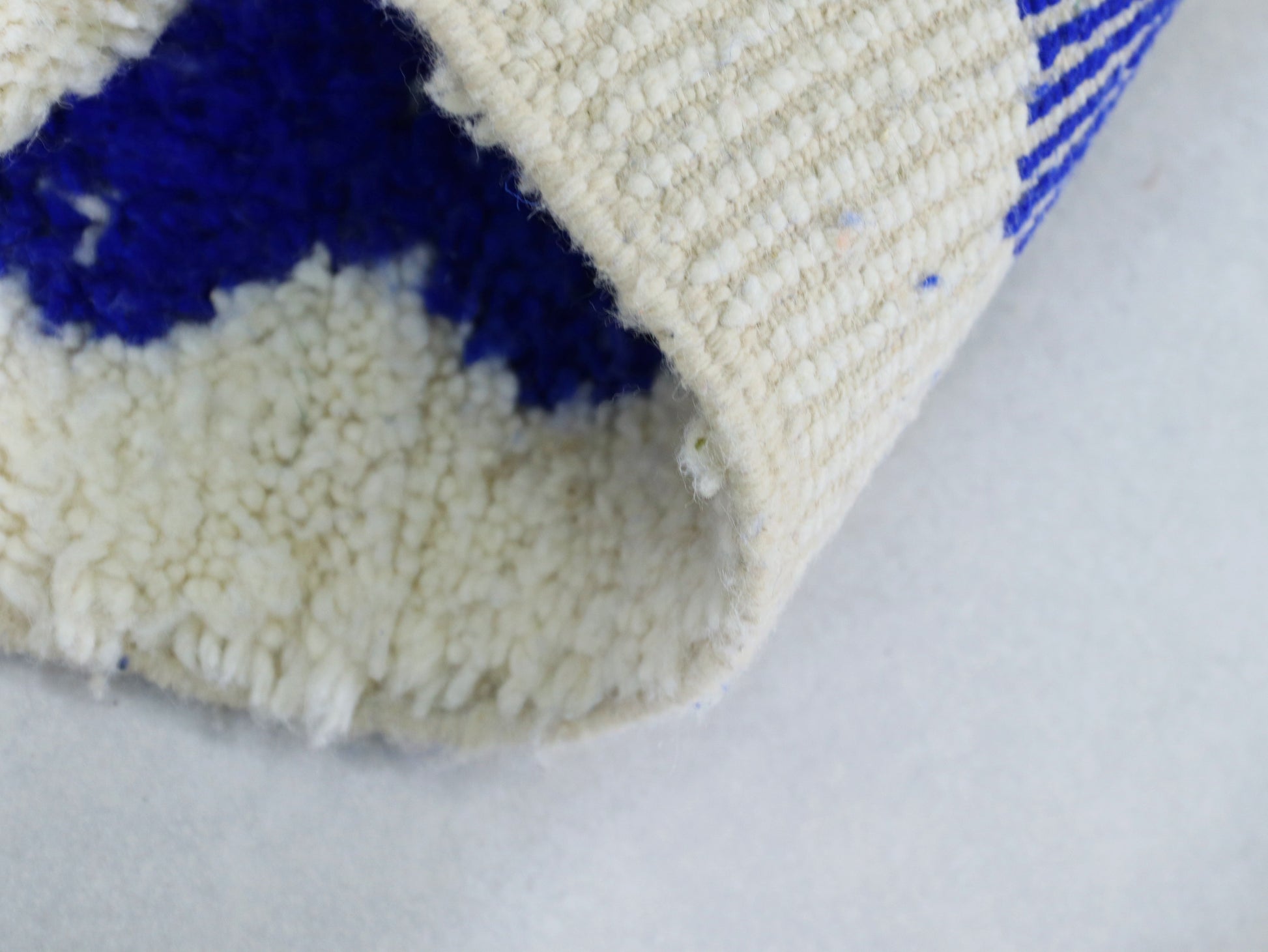 Elevate your space with this handwoven Beni Ourain rug, crafted from 100% wool for a plush and cozy feel. Featuring a bold modern wave pattern in striking blue on a soft ivory background, this Moroccan rug blends traditional Berber craftsmanship with contemporary design. Perfect for a bohemian, minimalist, or modern home, this Moroccan wool rug adds warmth and texture to any living room, bedroom, or office. Timeless yet unique, this Beni Ourain carpet is a must-have statement piece for lovers of authentic Moroccan decor.