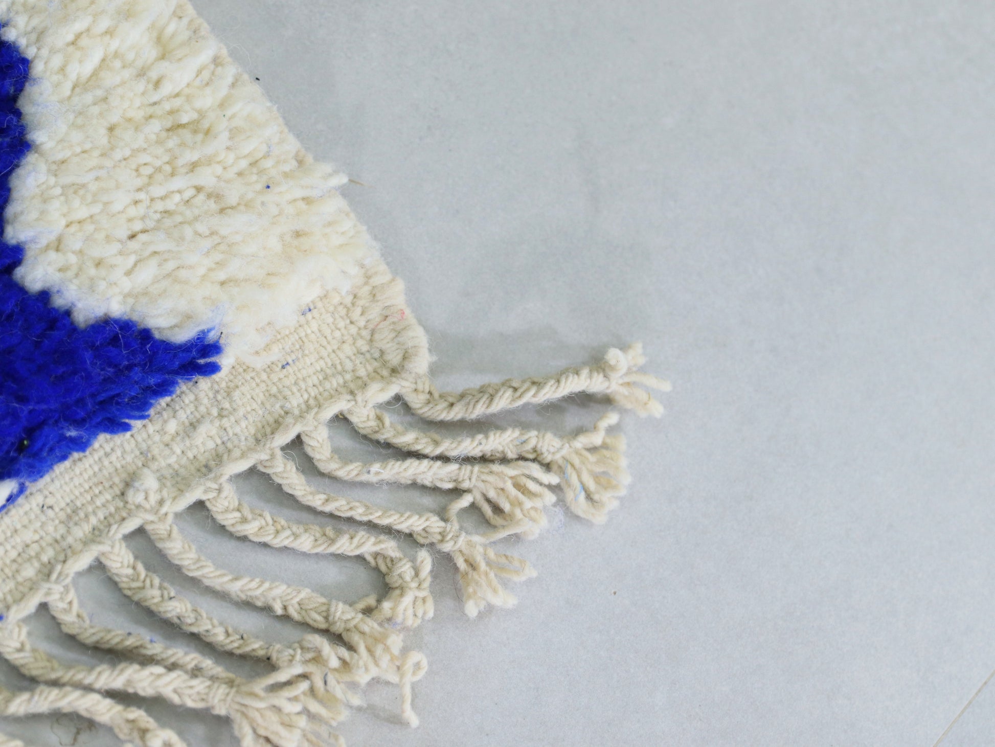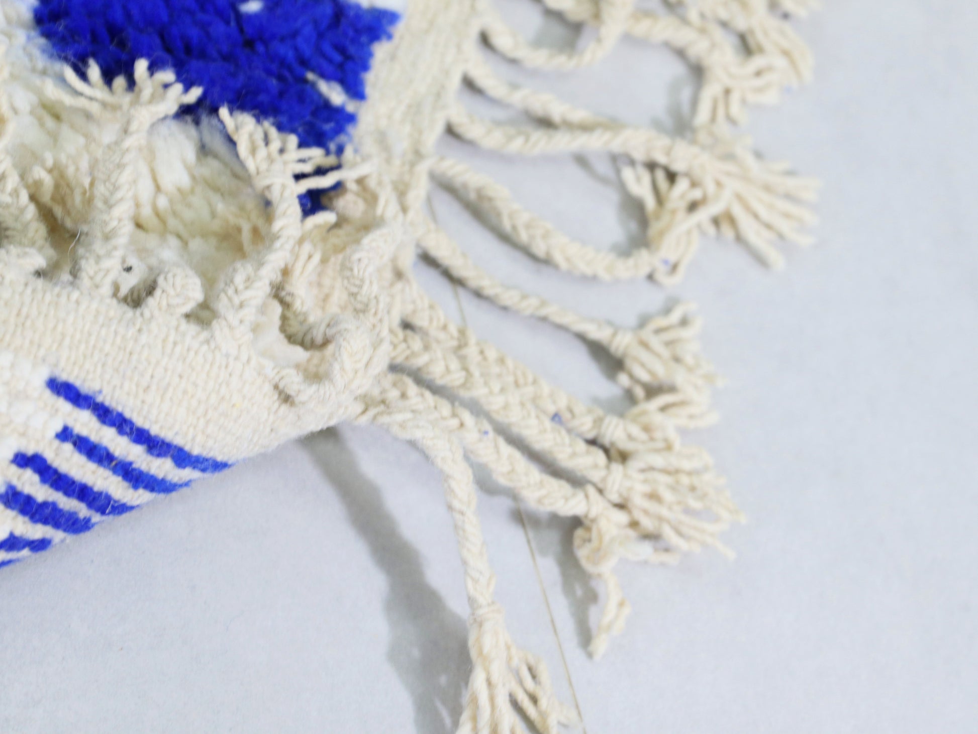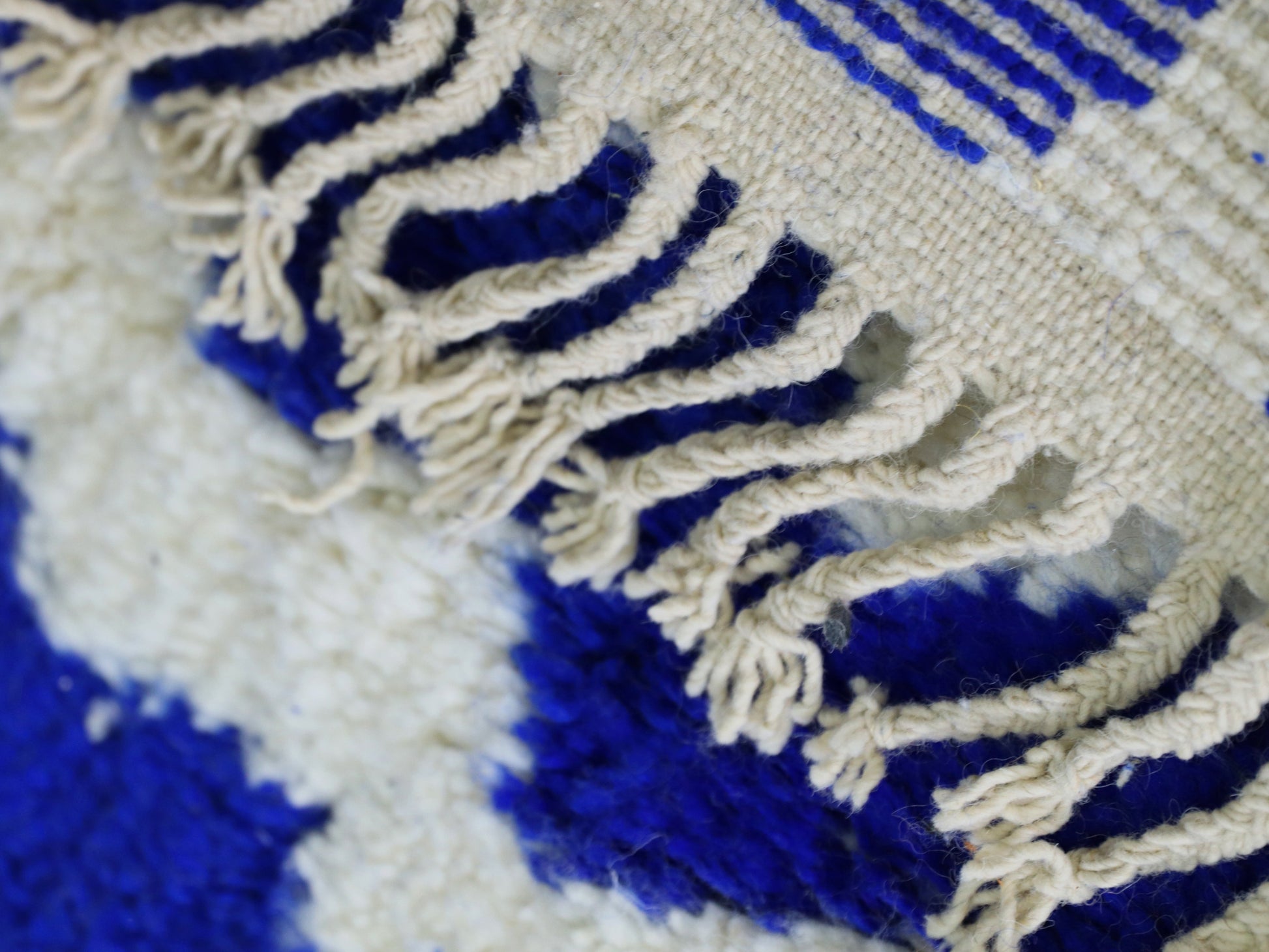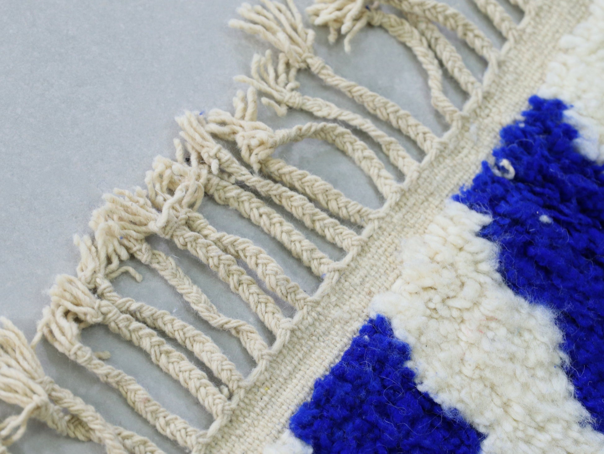 Elevate your space with this handwoven Beni Ourain rug, crafted from 100% wool for a plush and cozy feel. Featuring a bold modern wave pattern in striking blue on a soft ivory background, this Moroccan rug blends traditional Berber craftsmanship with contemporary design. Perfect for a bohemian, minimalist, or modern home, this Moroccan wool rug adds warmth and texture to any living room, bedroom, or office. Timeless yet unique, this Beni Ourain carpet is a must-have statement piece for lovers of authentic Moroccan decor.