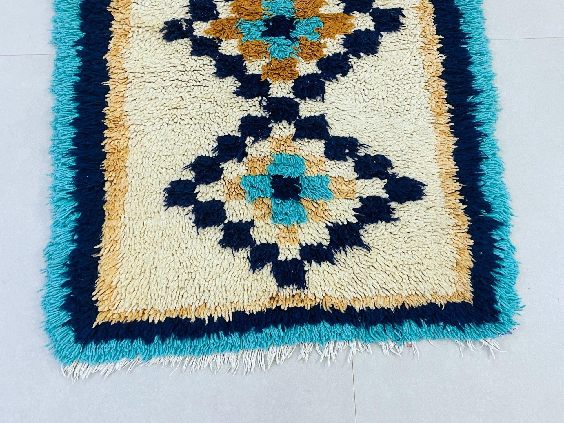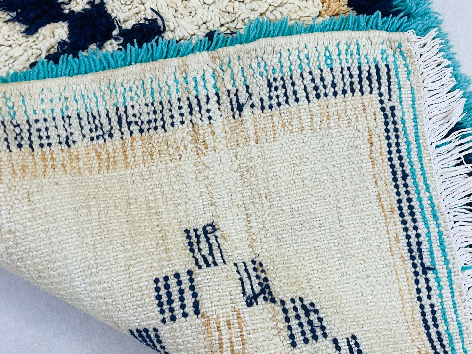 Add a touch of Moroccan charm to your home with this stunning handmade wool rug. Woven by skilled artisans, this vintage Berber runner features intricate geometric patterns in warm beige, deep navy, and vibrant turquoise, bringing a perfect blend of tradition and modern boho style. Its plush, high-pile wool texture offers a cozy feel underfoot, making it ideal for an entryway, bedside, or as a decorative accent in any space.