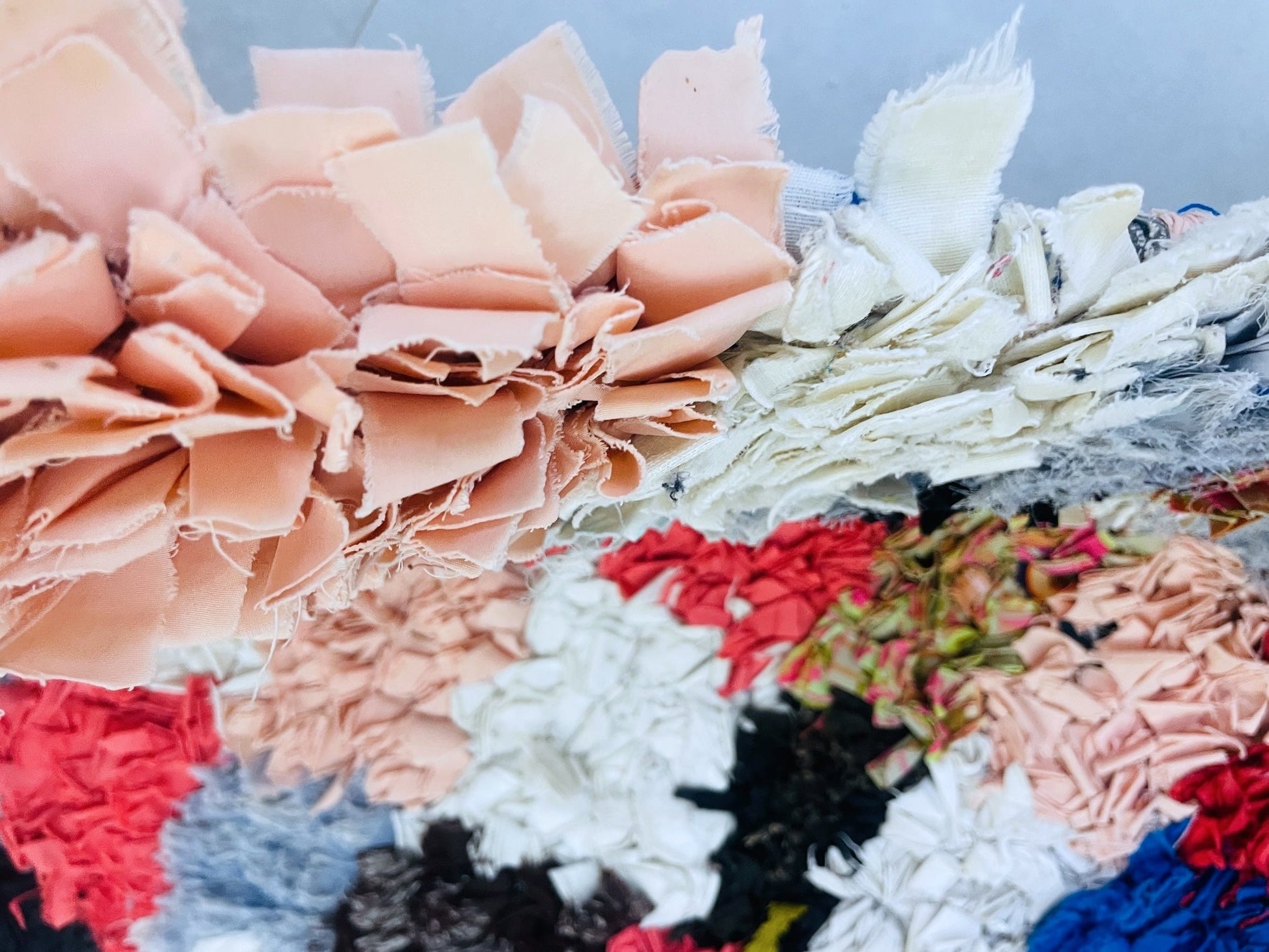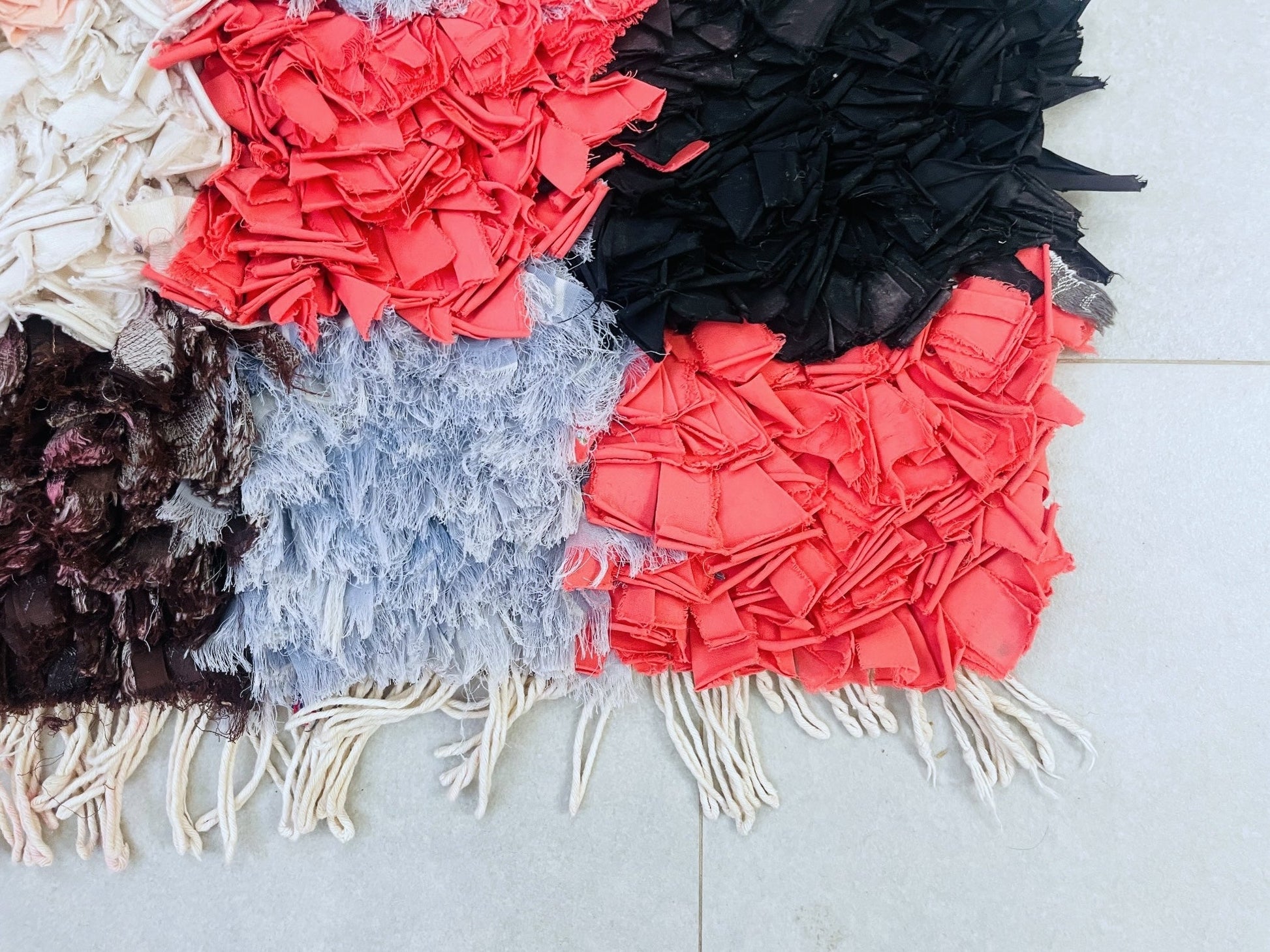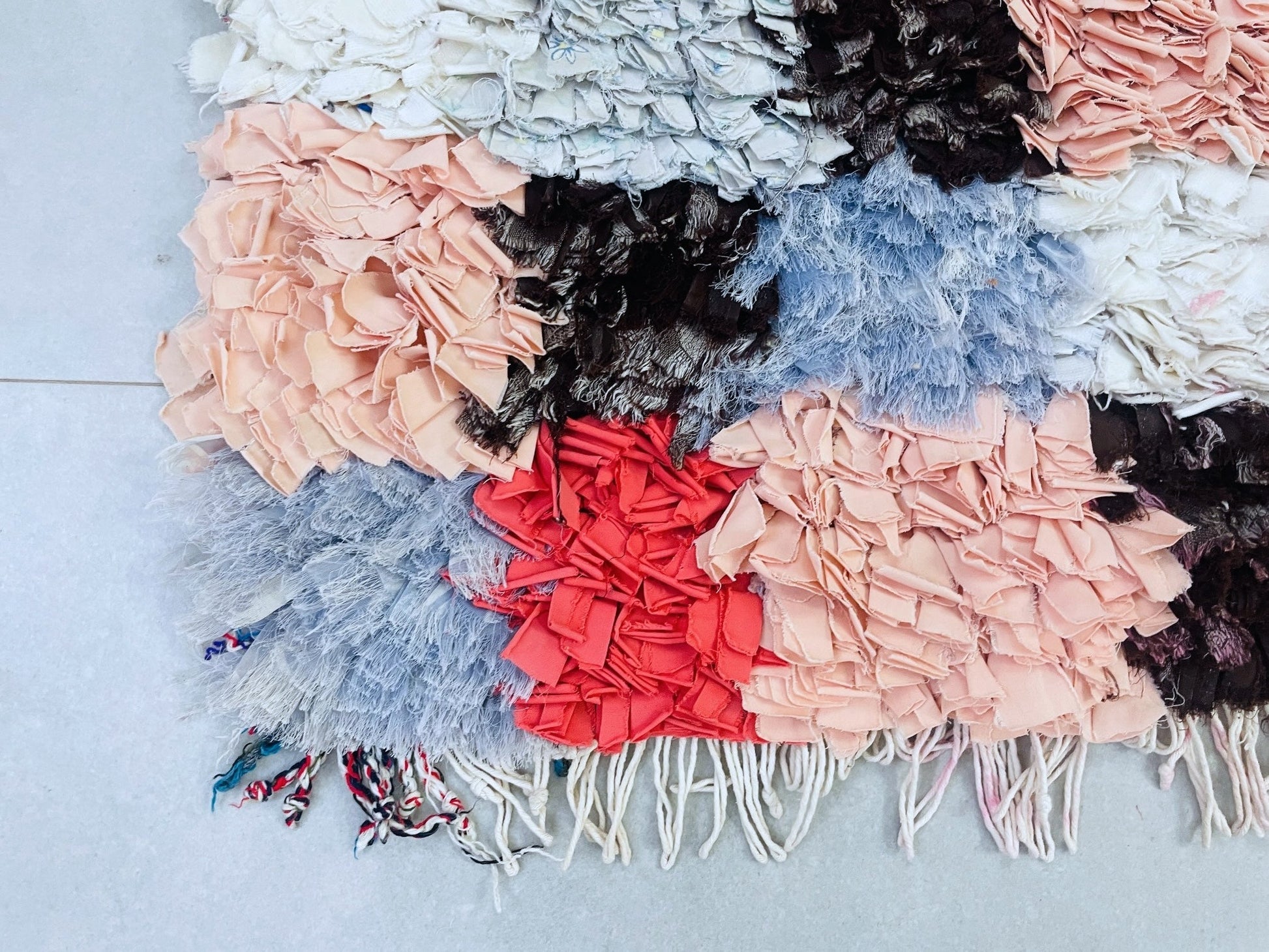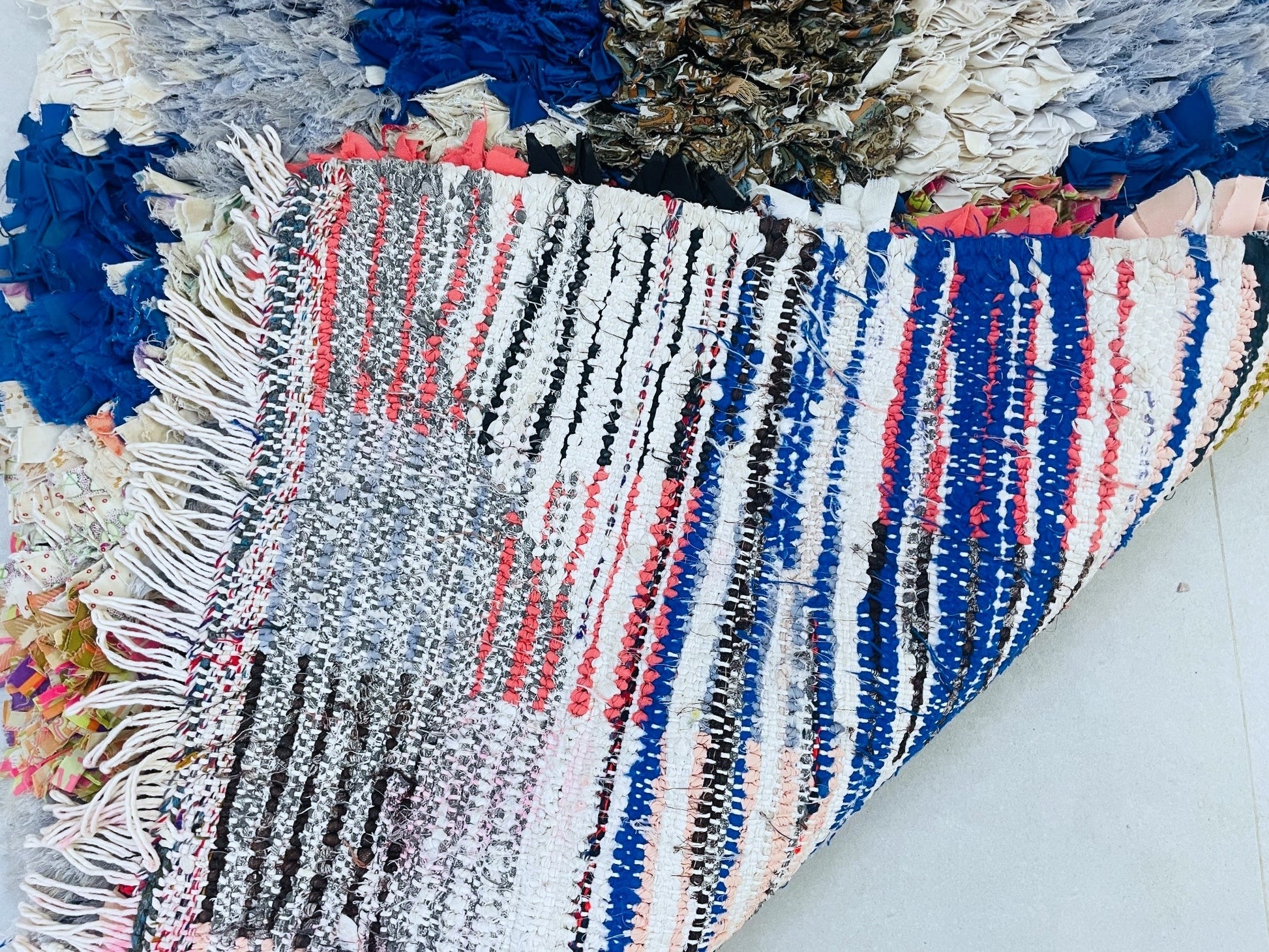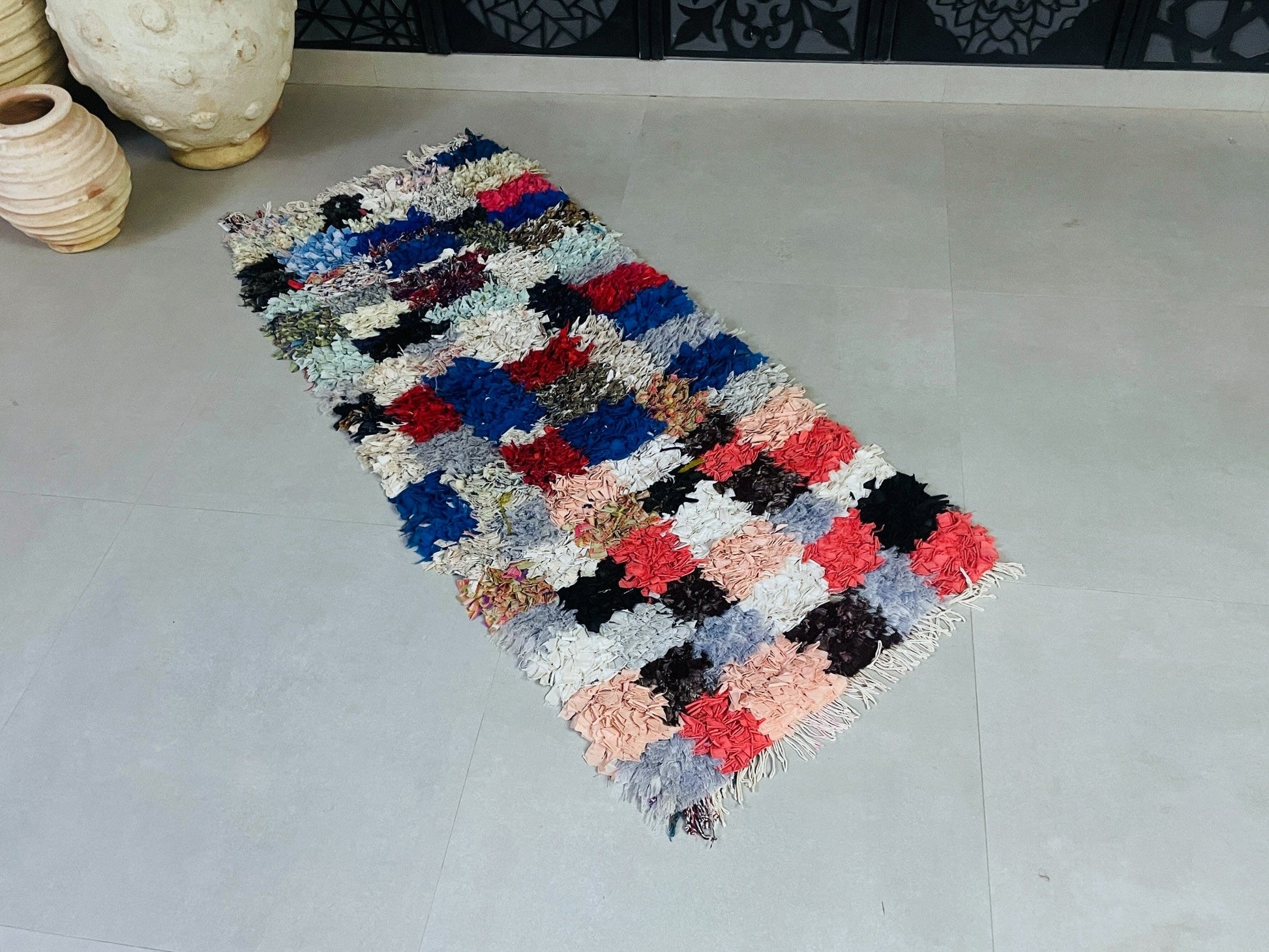 Bring Moroccan charm into your home with this vibrant handmade Boucherouite rug featuring a stunning patchwork design in a rainbow of colors. Measuring 74 cm x 171 cm = 2.4 ft x 5.6 ft, this eco-friendly rug is crafted from recycled textiles, making it a sustainable and stylish choice for any living space.