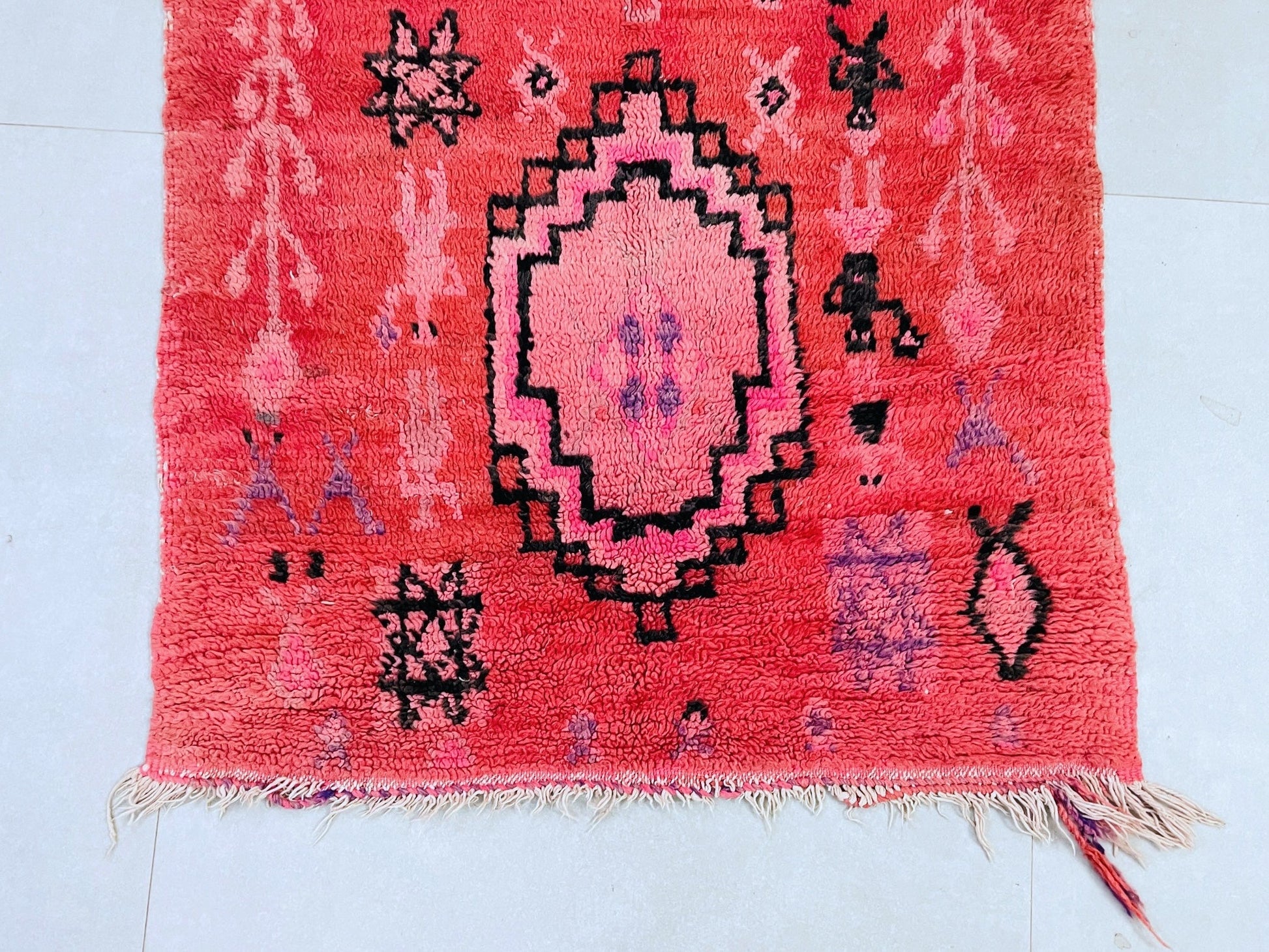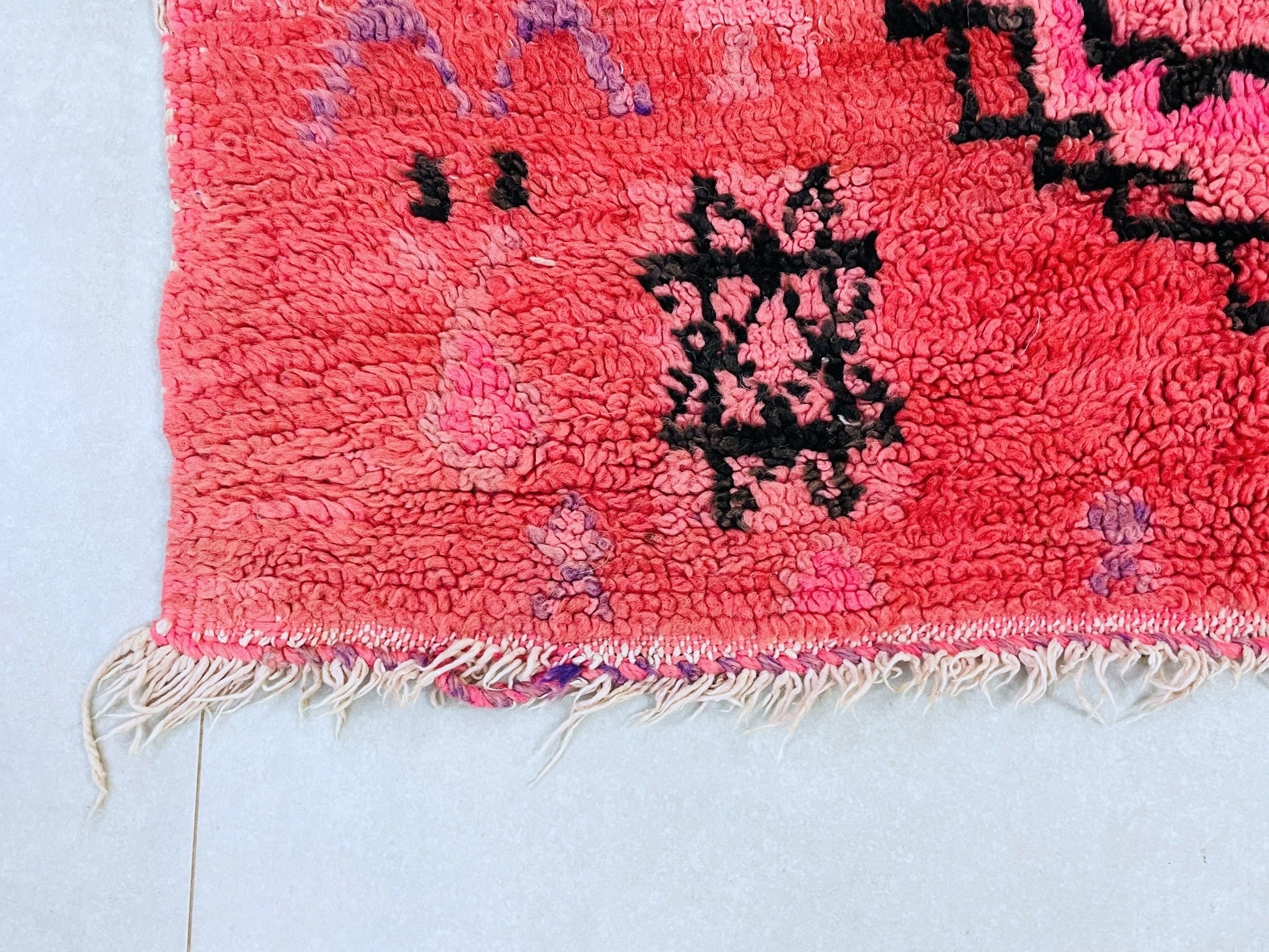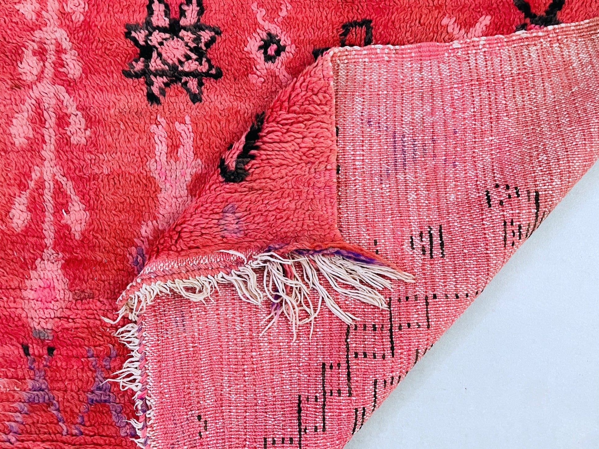 This stunning vintage Moroccan rug in a vibrant pink shade is a true masterpiece of craftsmanship. Handmade from premium materiel, it features intricate tribal motifs and geometric designs, making it a unique and stylish addition to any space.