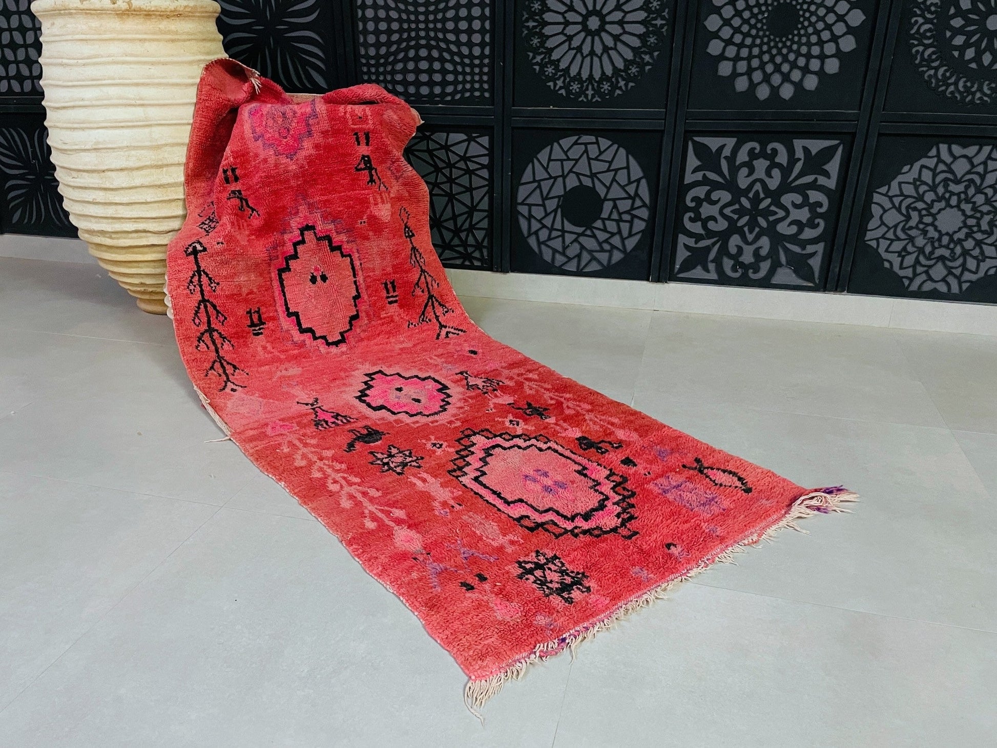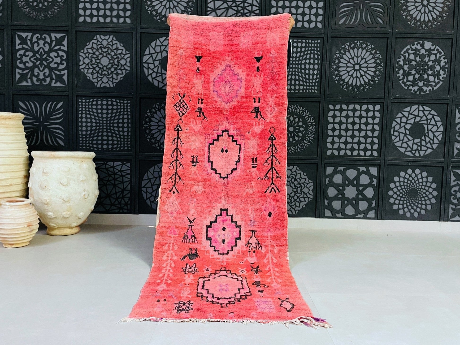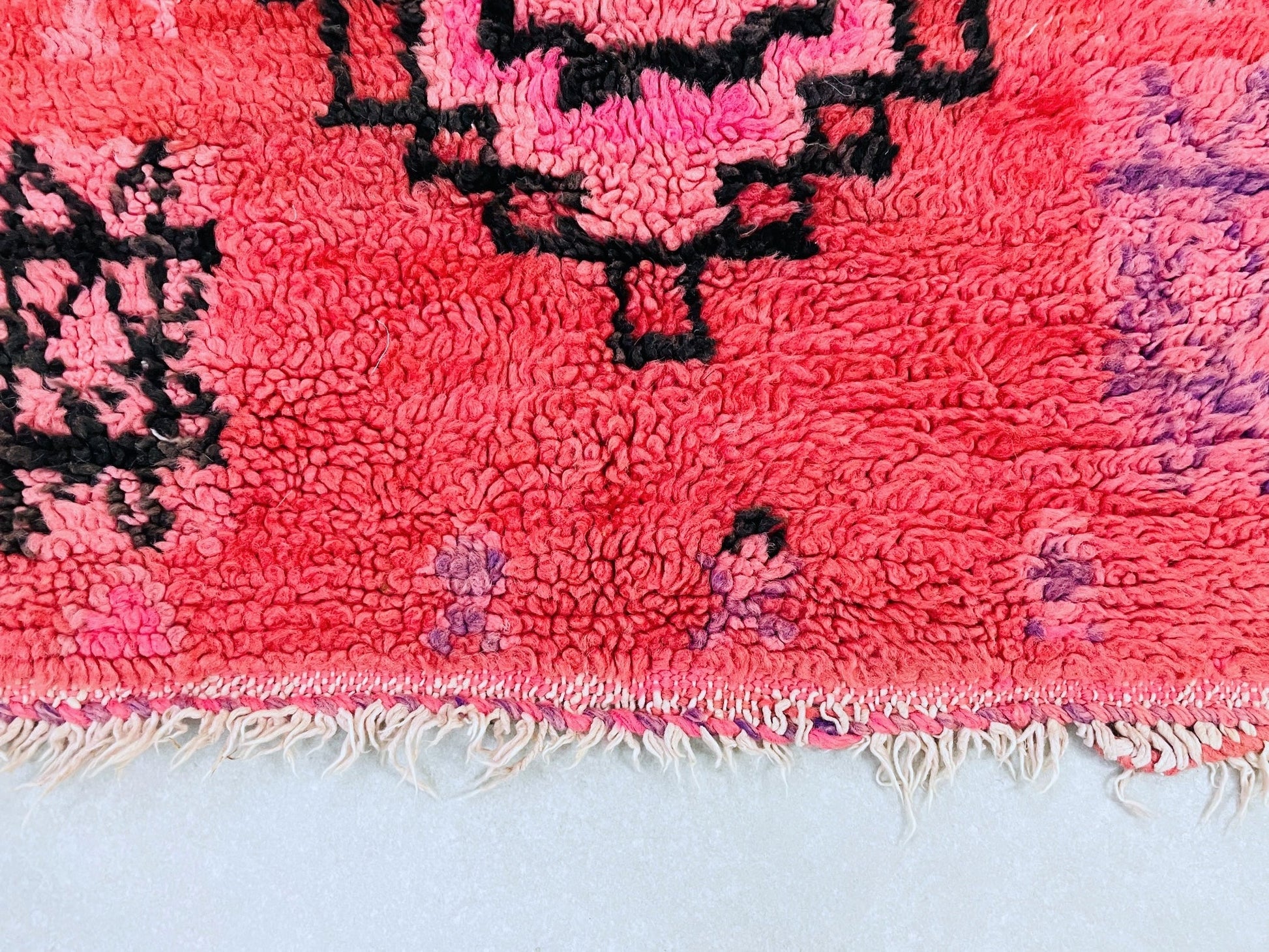 This stunning vintage Moroccan rug in a vibrant pink shade is a true masterpiece of craftsmanship. Handmade from premium materiel, it features intricate tribal motifs and geometric designs, making it a unique and stylish addition to any space.