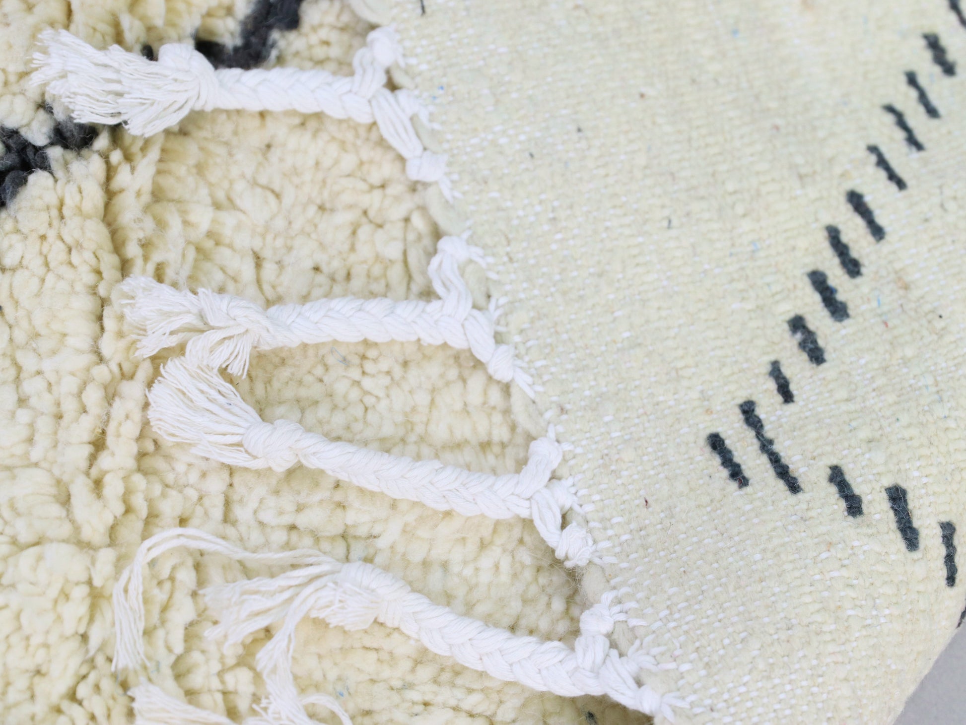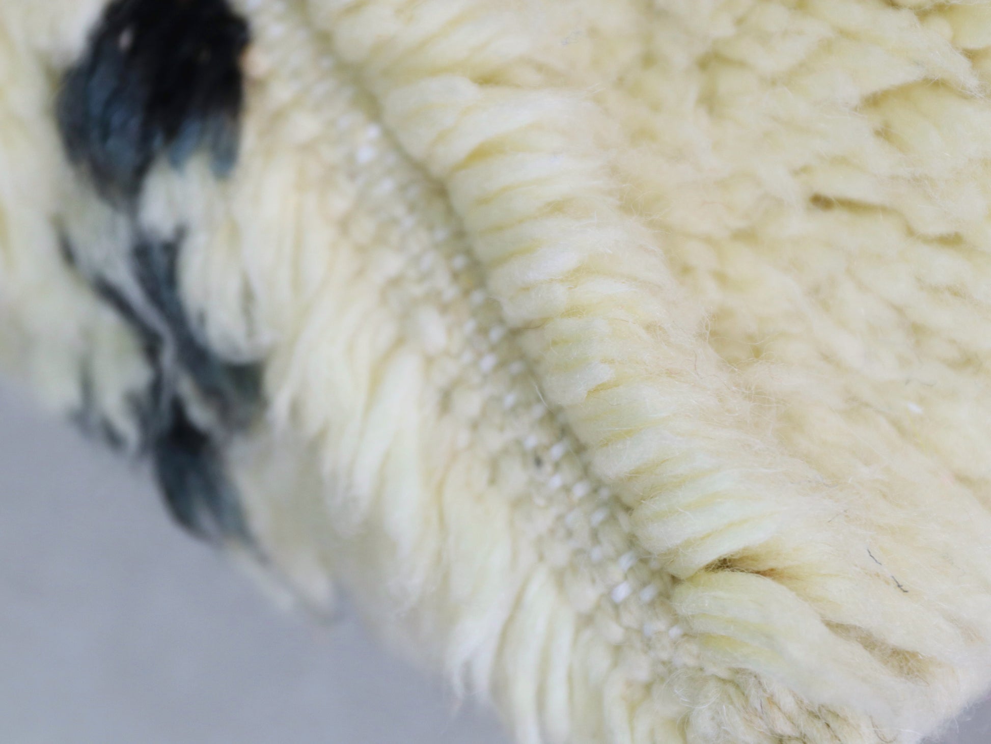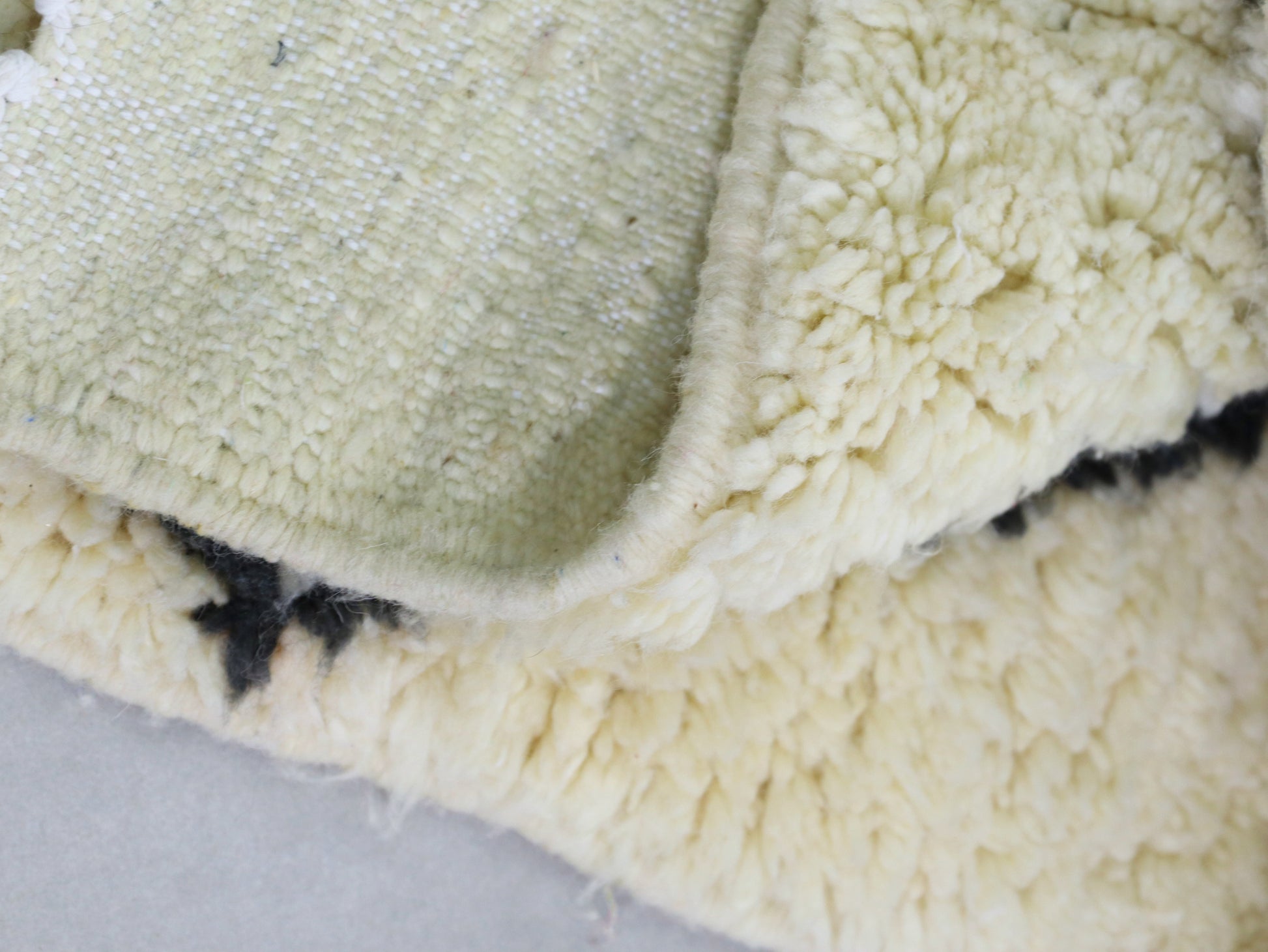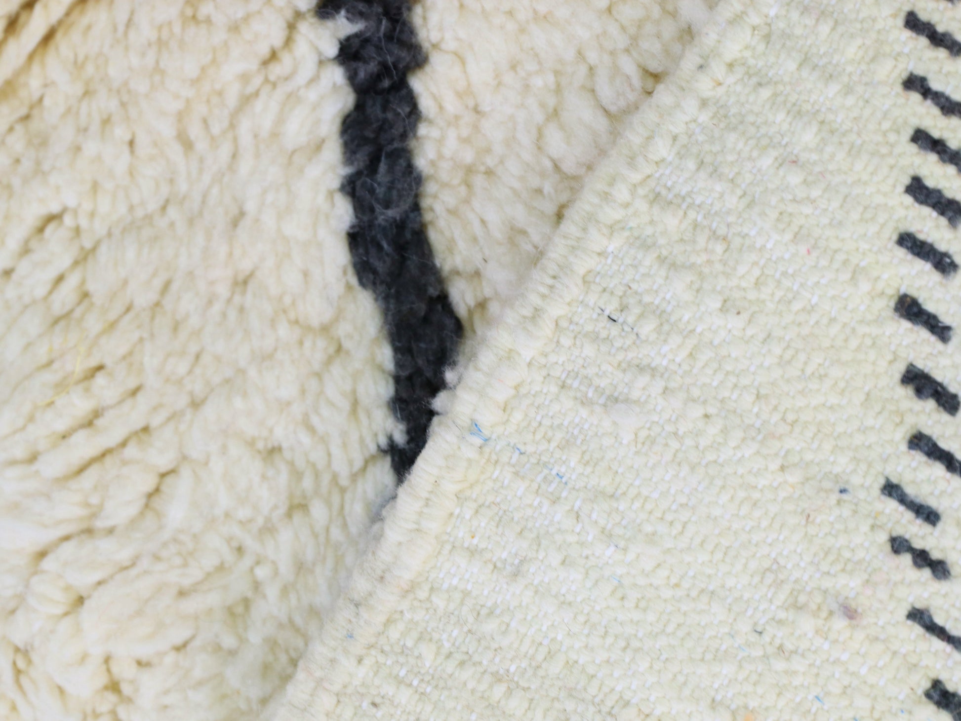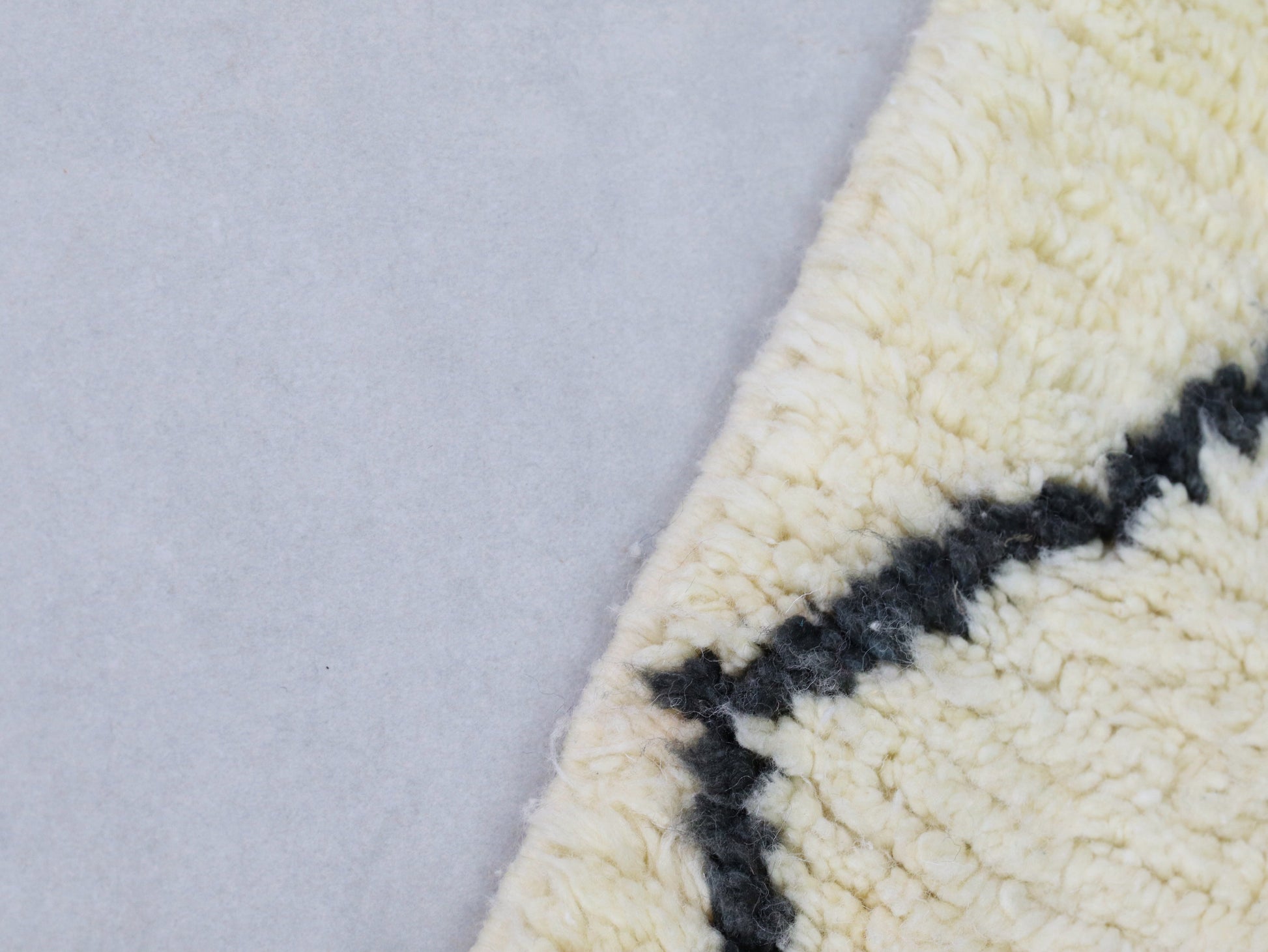 This handmade Beni Ourain rug showcases the timeless Moroccan diamond lattice in bold black lines over a soft ivory wool base. Carefully crafted by Berber artisans using 100% natural wool, this high-pile rug adds texture, warmth, and tribal authenticity to minimalist, boho, and modern interiors. A classic design for effortless elegance and comfort.
