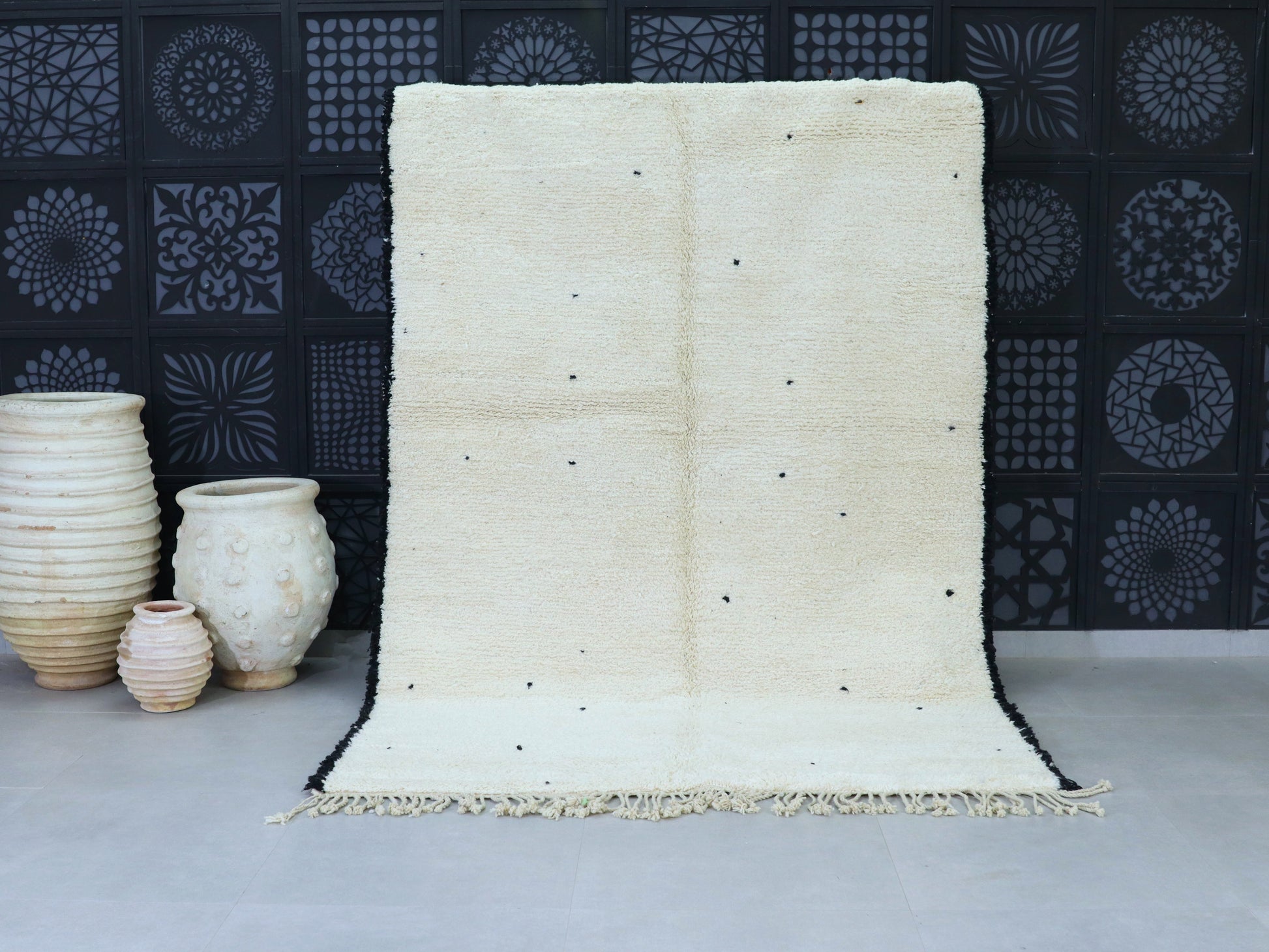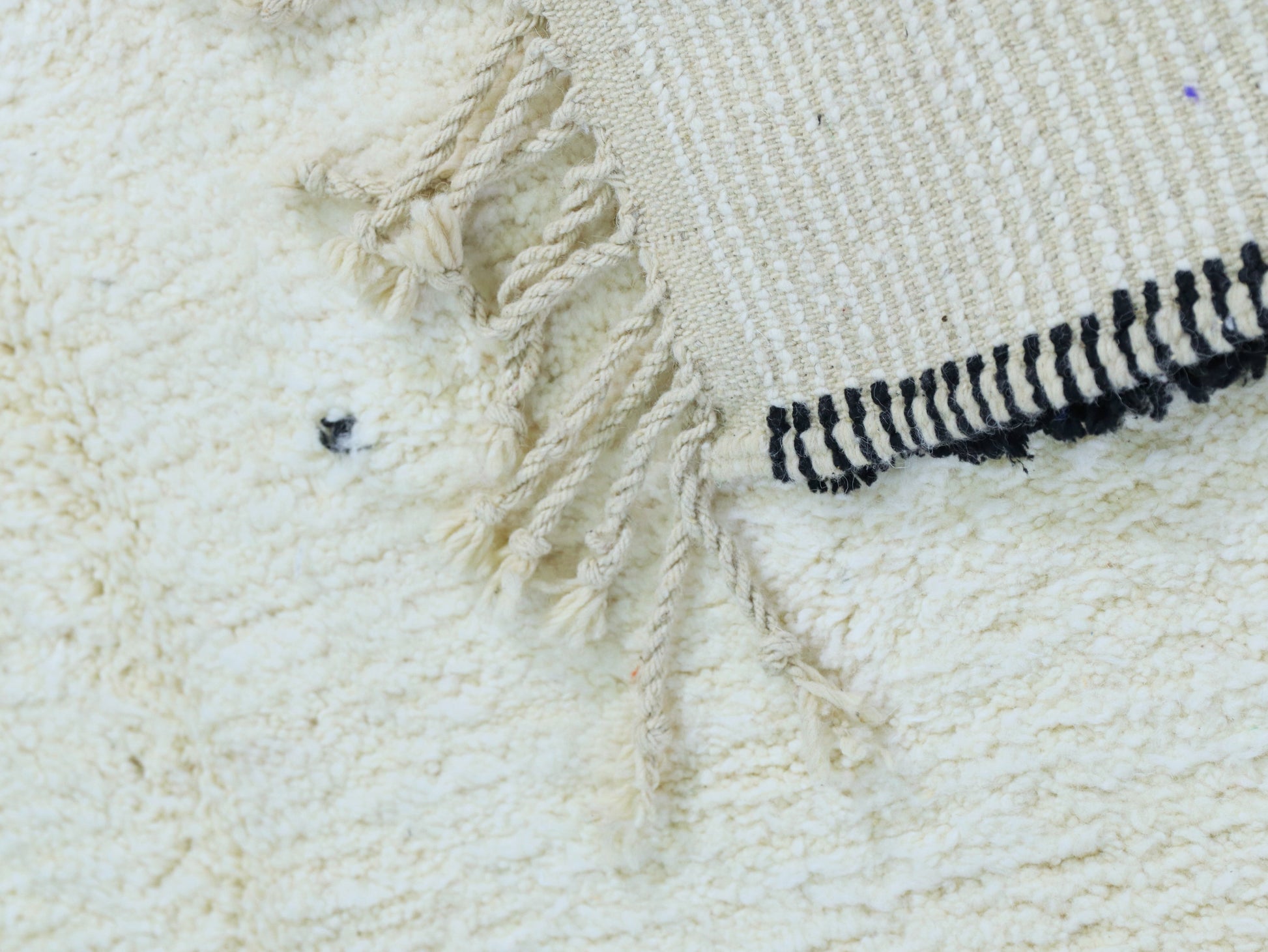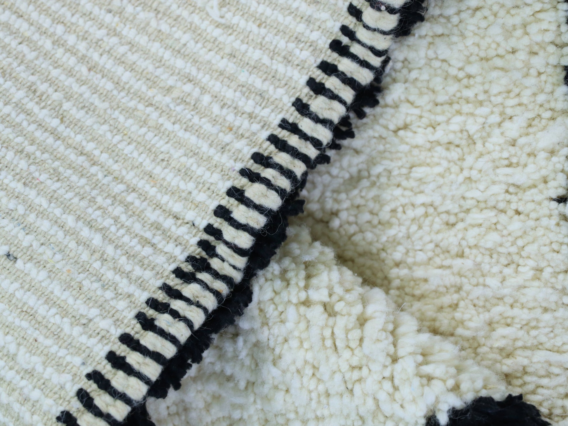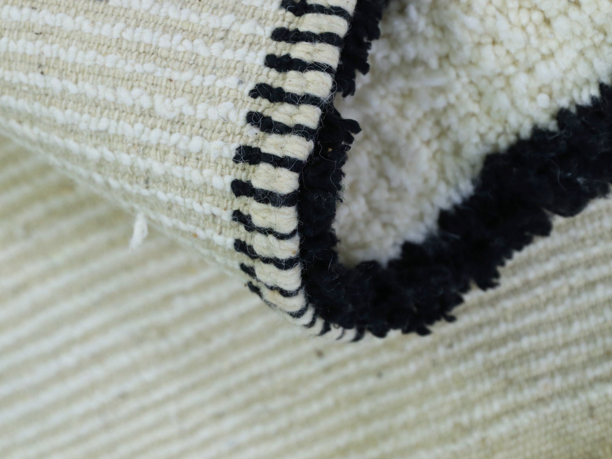 This handmade Moroccan wool rug features a minimalist cream design with subtle black accents, creating a clean and modern aesthetic. Its simplicity and elegance make it a versatile piece that complements a variety of interior styles, from boho to contemporary. Perfect for a cozy, understated look.