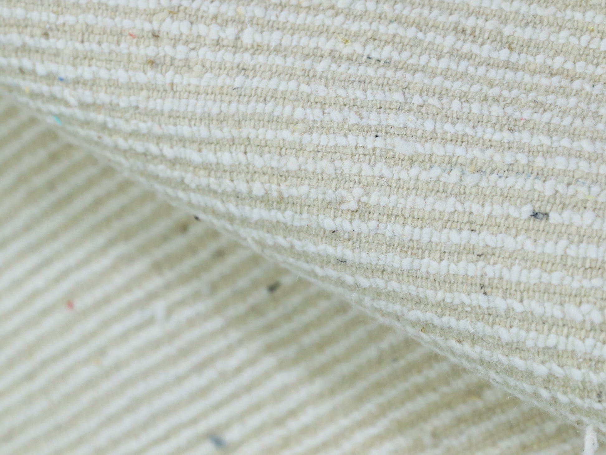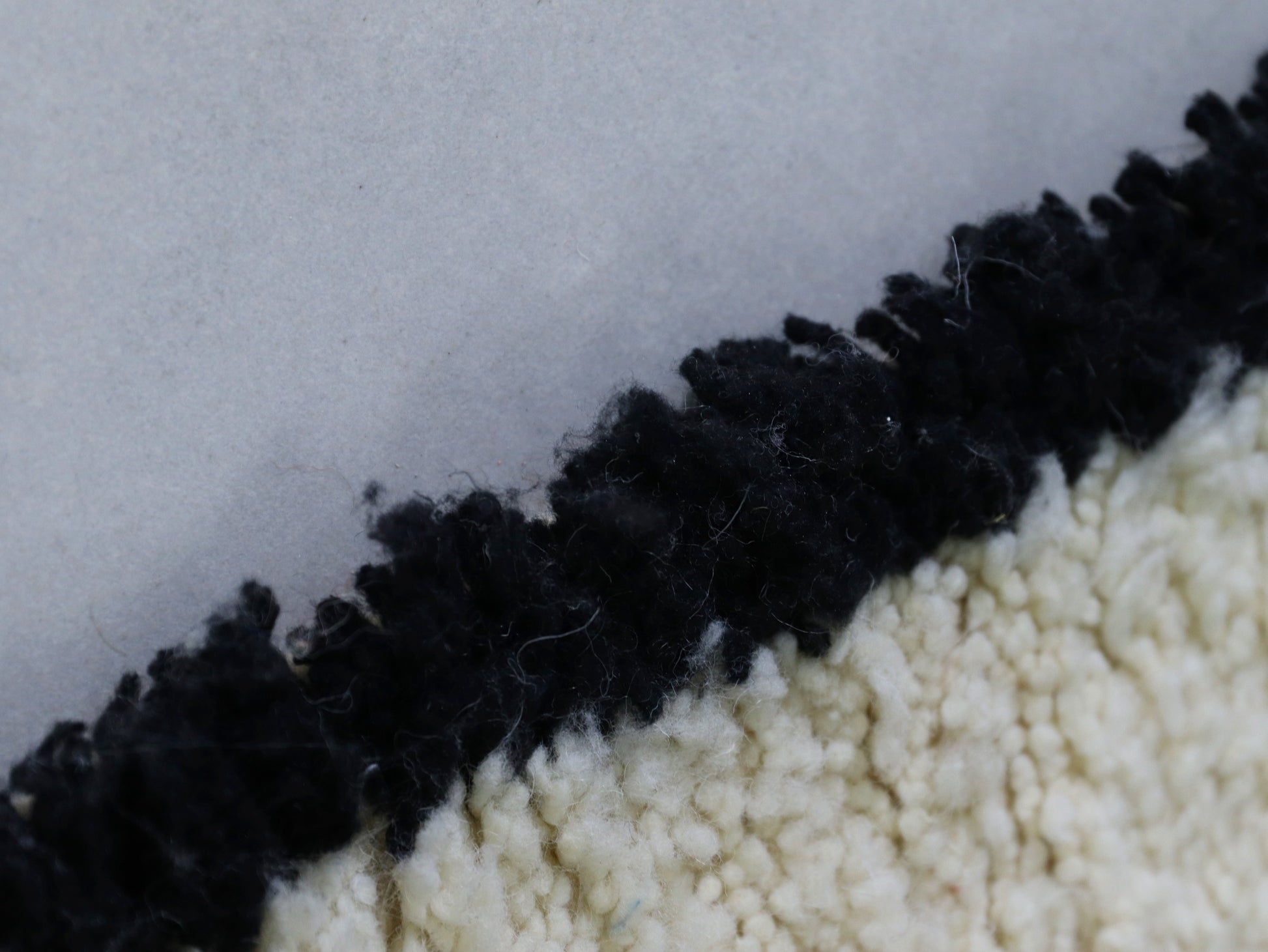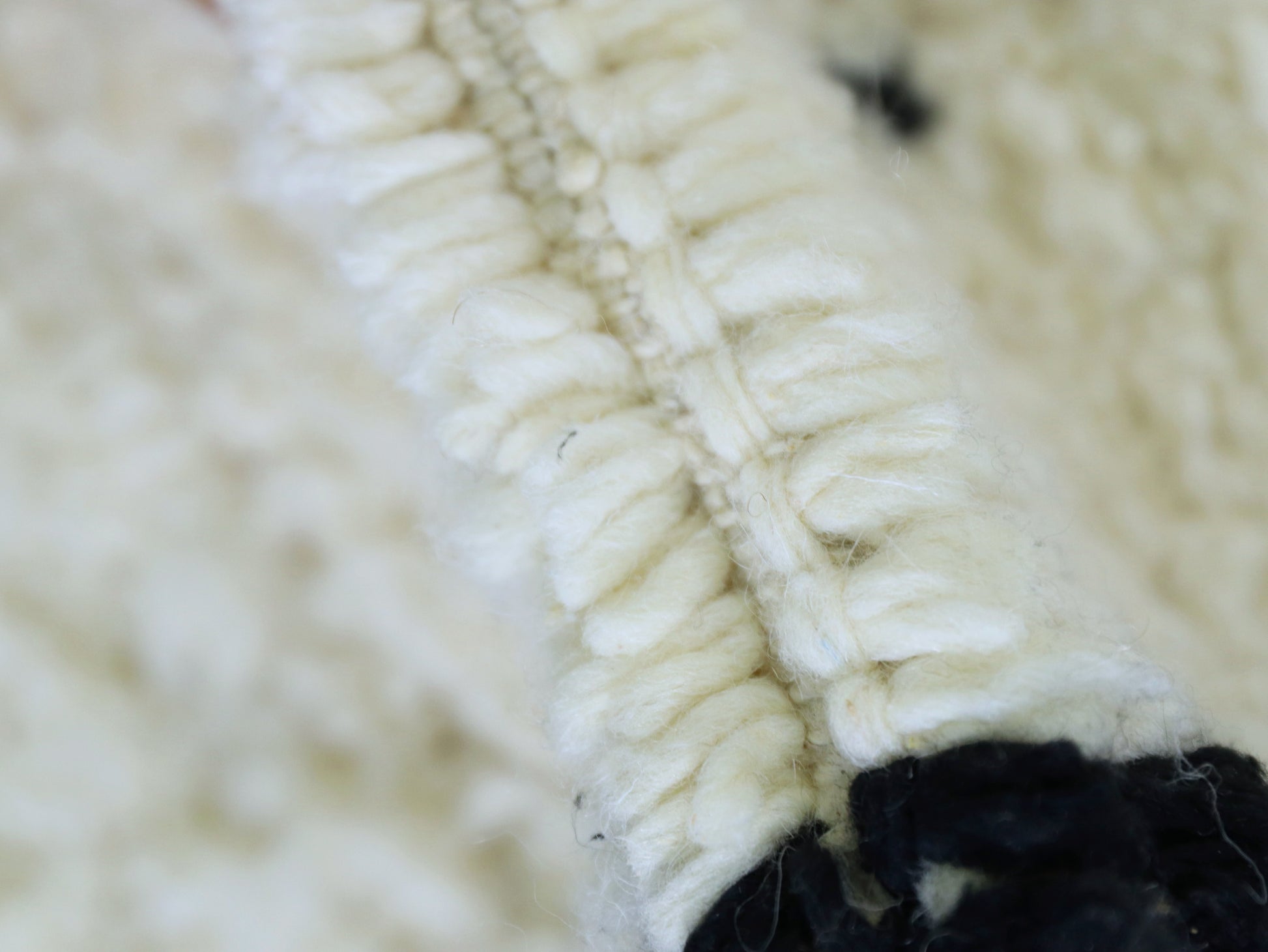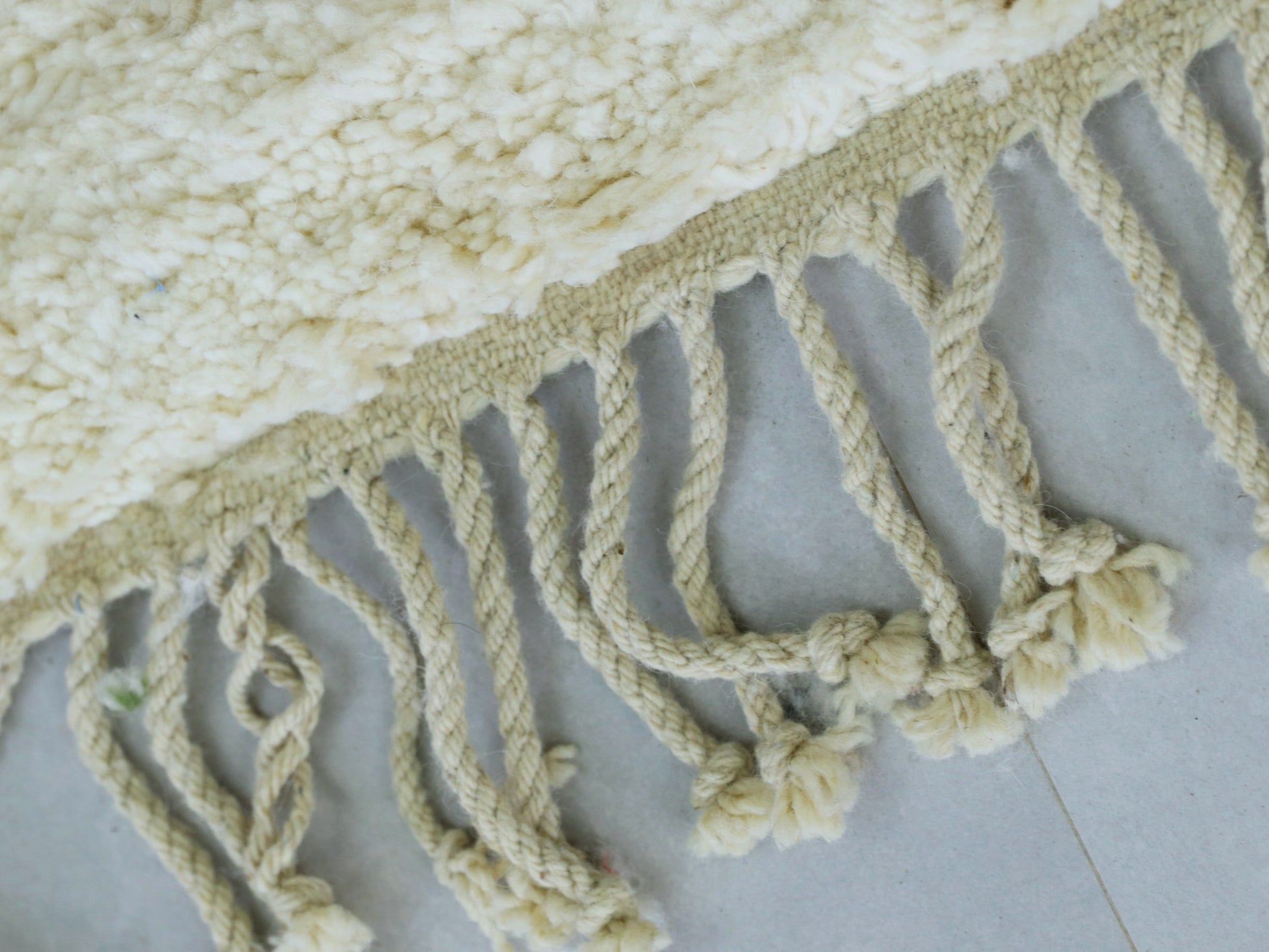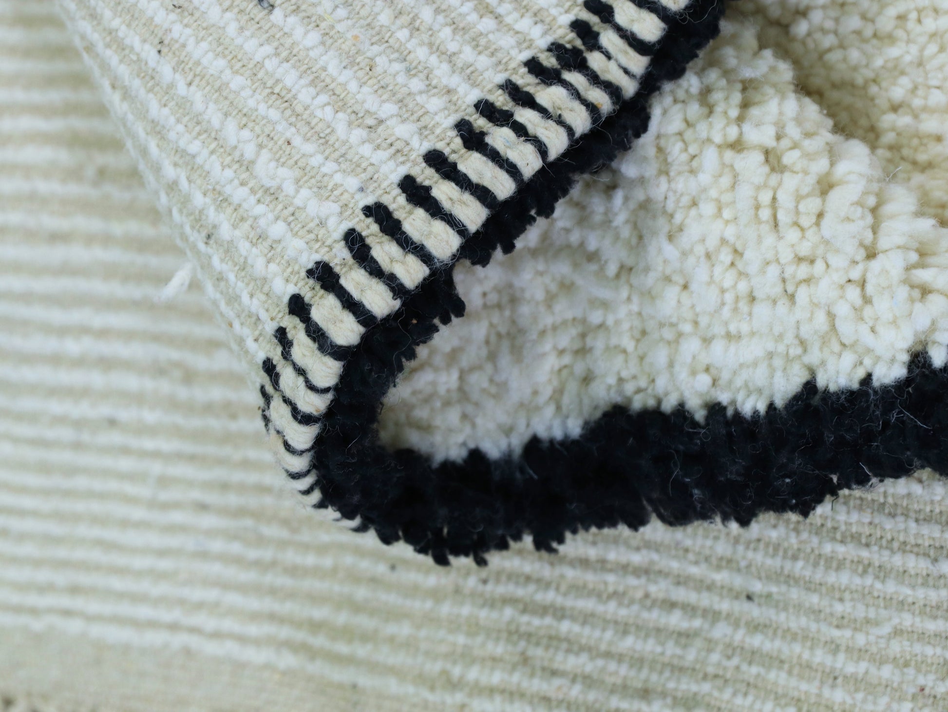 This handmade Moroccan wool rug features a minimalist cream design with subtle black accents, creating a clean and modern aesthetic. Its simplicity and elegance make it a versatile piece that complements a variety of interior styles, from boho to contemporary. Perfect for a cozy, understated look.