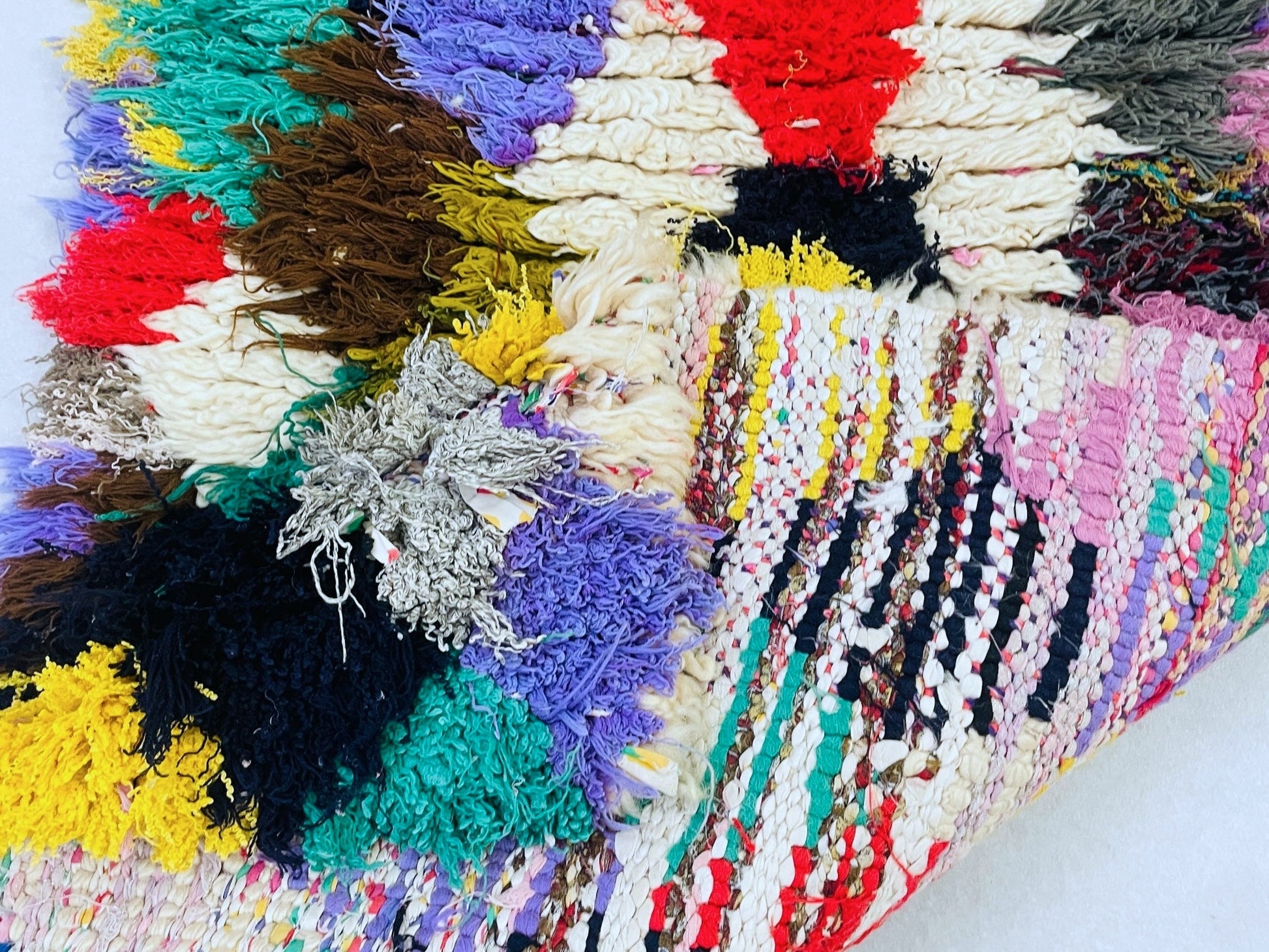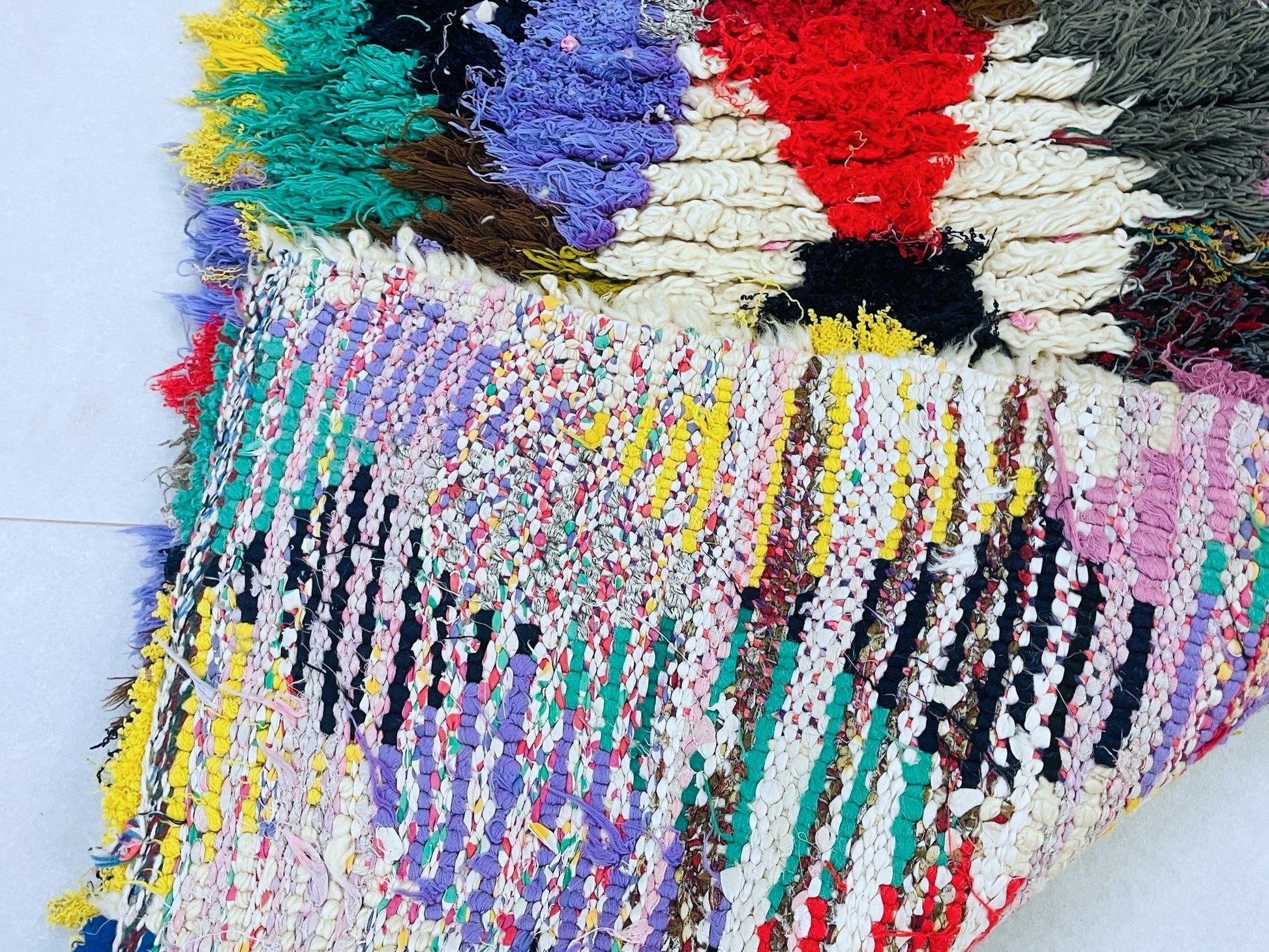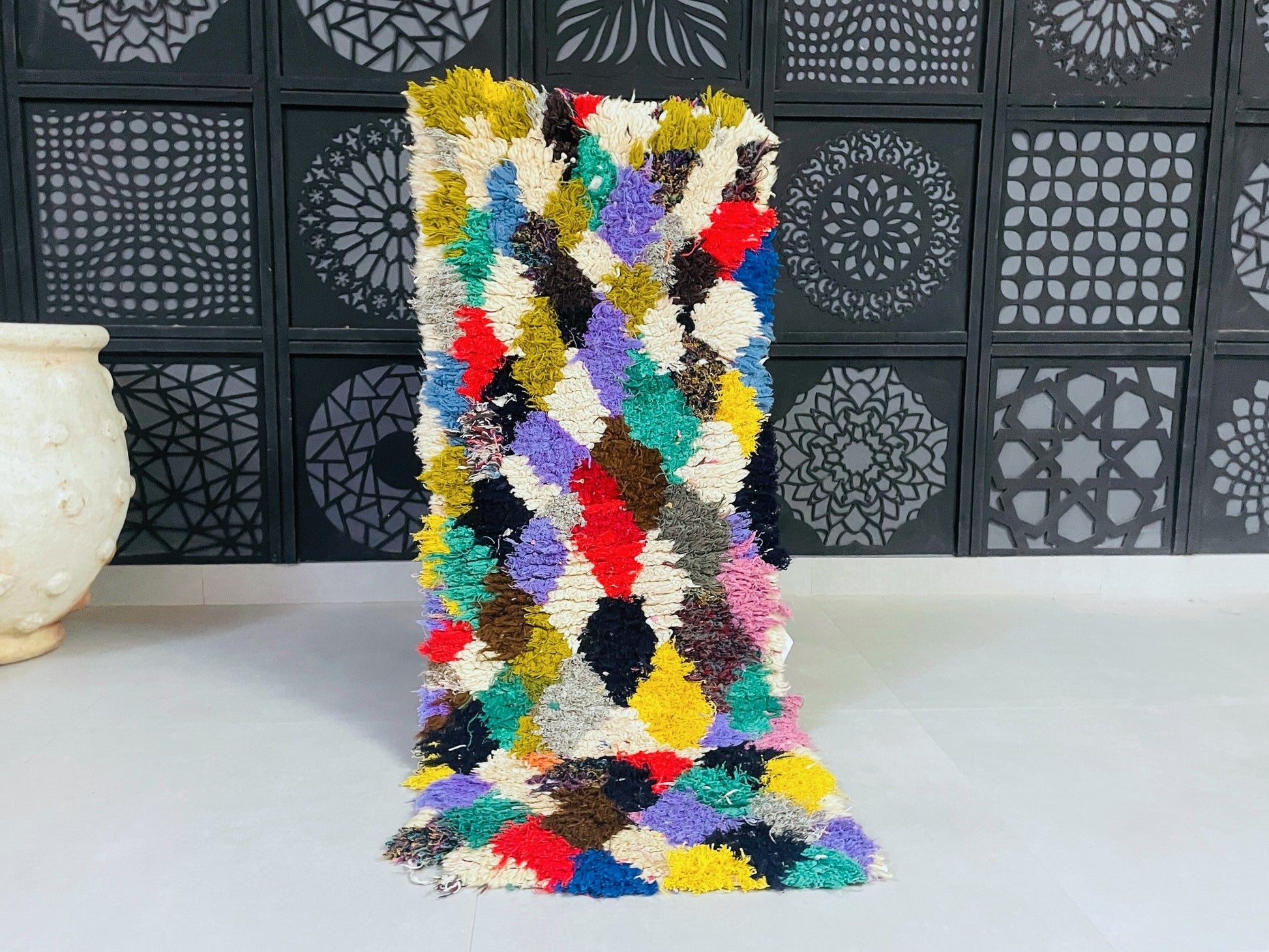 Infuse your space with bold colors and Moroccan charm with this vibrant Boucherouite runner. Handmade by Berber artisans, this one-of-a-kind rug showcases an eclectic patchwork of colorful diamond patterns, adding a lively and artistic touch to any interior. Crafted from recycled textiles, this rug is both eco-friendly and a stunning expression of Moroccan craftsmanship.