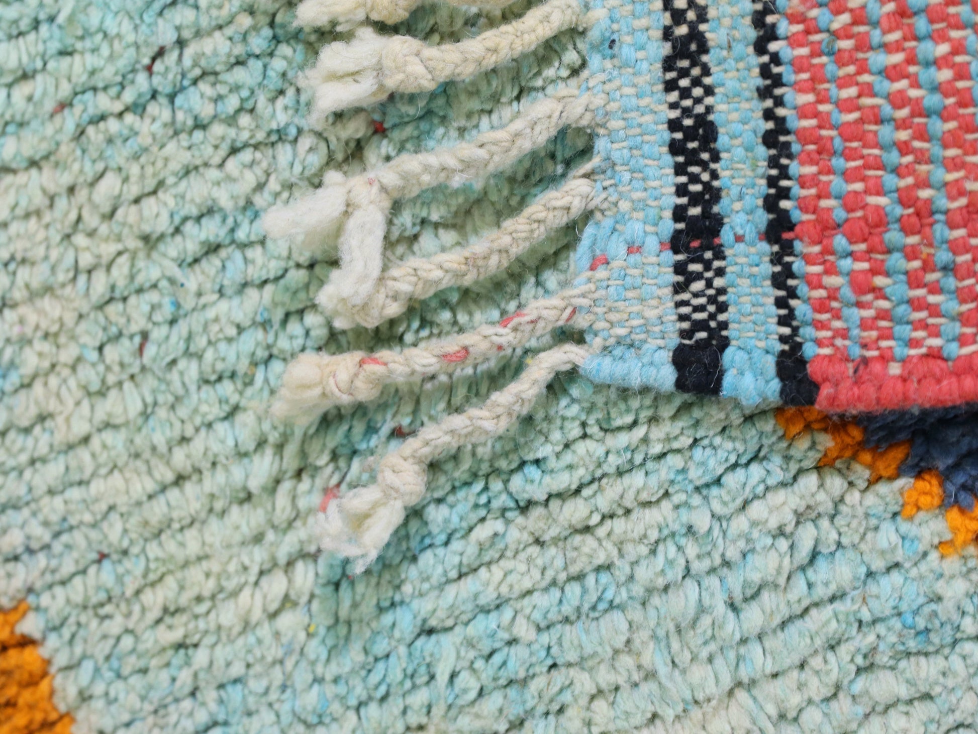 Elevate your hallway or entryway with this eye-catching Moroccan runner rug. Handwoven by Berber artisans in the Atlas Mountains, this unique piece features bold geometric patterns in vibrant orange, yellow, and blue tones. The natural wool and traditional tribal motifs bring authenticity and warmth to your home, while the long and narrow shape makes it ideal for hallways or narrow spaces.