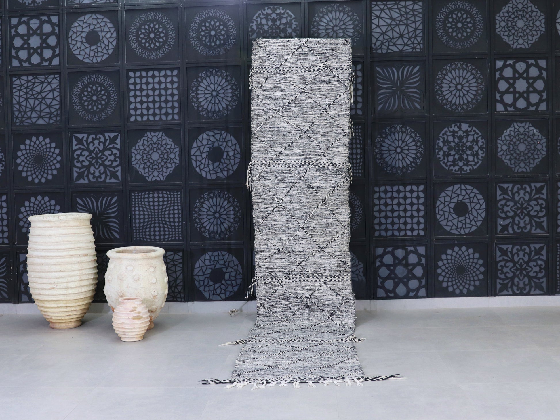 Bring timeless Moroccan charm into your home with this handwoven black and white wool runner rug. Crafted in the Atlas Mountains, this long Beni Ourain-style runner features a geometric diamond pattern that adds depth and elegance to hallways, kitchens, or narrow entryways.
