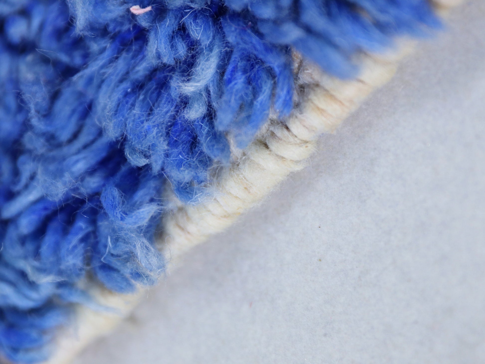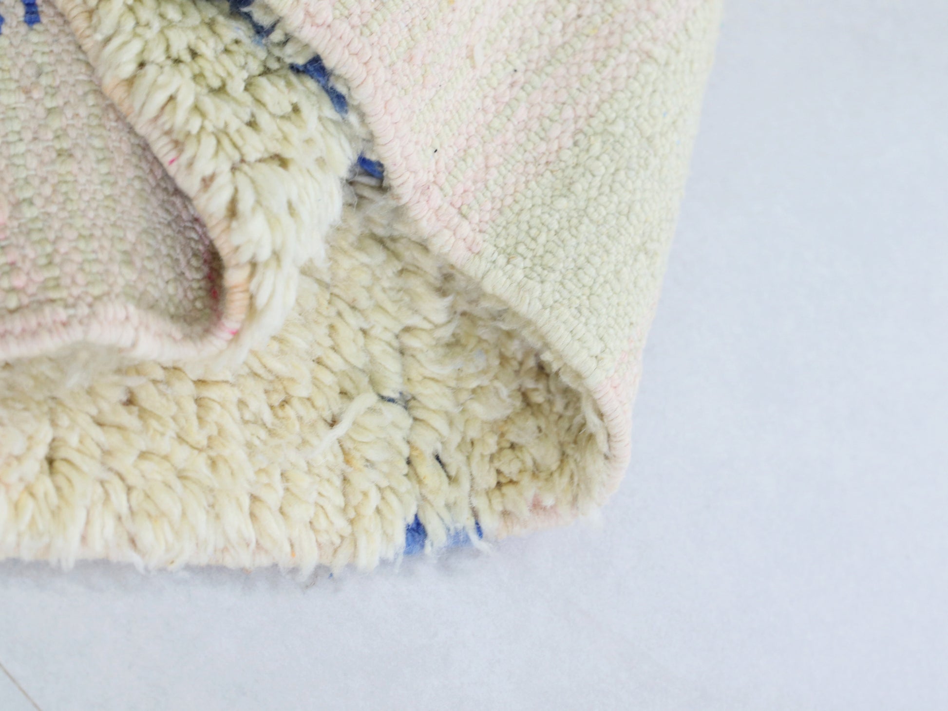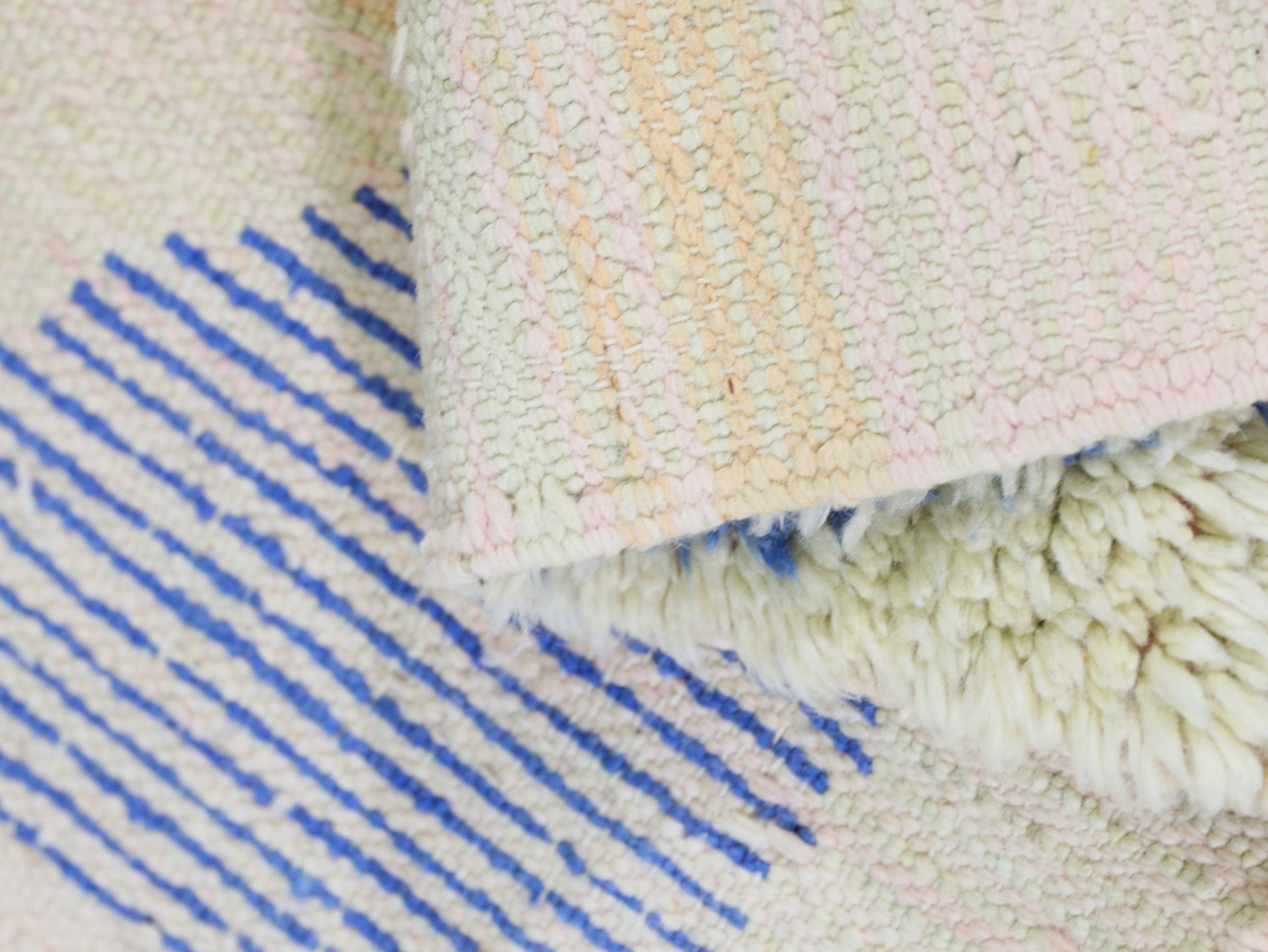 Add a touch of artistic elegance to your home with this stunning Moroccan wool rug. Handwoven with care by skilled artisans, this rug features an abstract design with bold blue geometric shapes set against a soothing beige background. Its soft wool texture and intricate patterns make it a unique centerpiece for any living room, bedroom, or cozy corner.